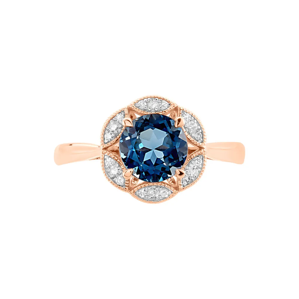 Bague Or Rose 375/1000 Topaze London Blue Entourage Forme Fleur Oxydes De Zirconium