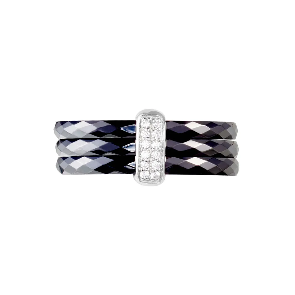 Bague Argent Blanc 925/1000 3 Anneaux Ceramique Noire Facettee Pavage Oxydes De Zirconium