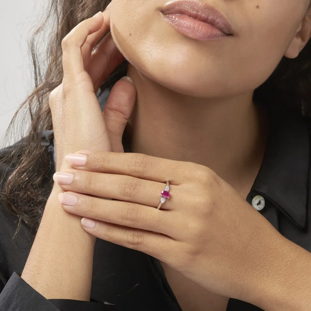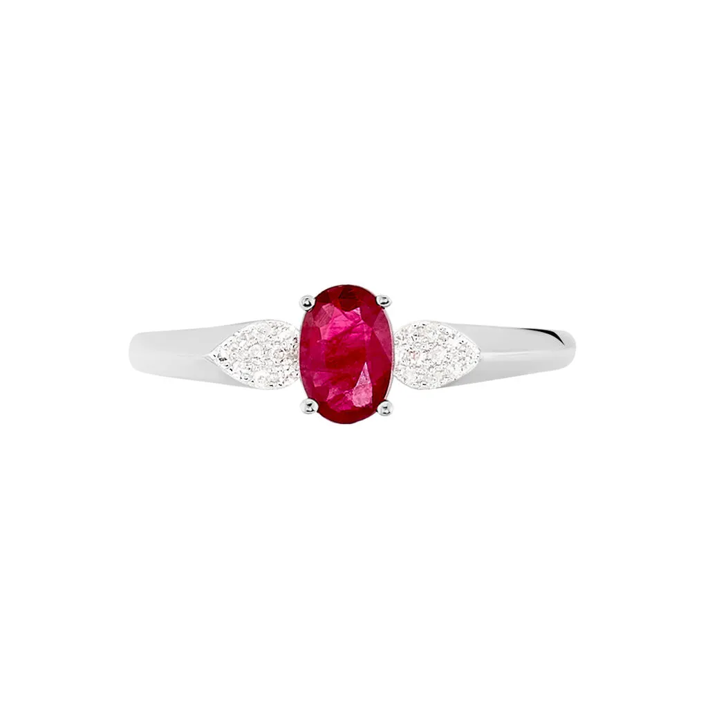 Bague Or Blanc 375/1000 Rubis Central Forme Ovale + Pavage Diamants
