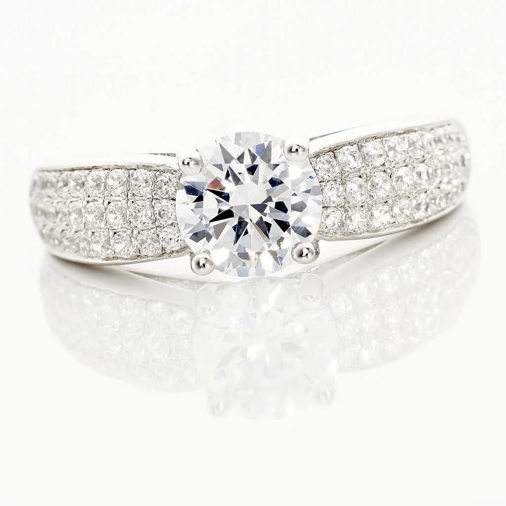 Bague Argent Blanc 925/1000 Oxyde De Zirconium Central Forme Ronde Pavage Oxyde De Zirconium