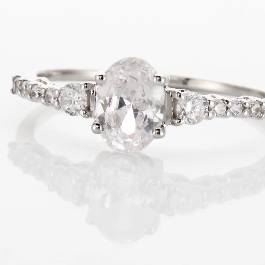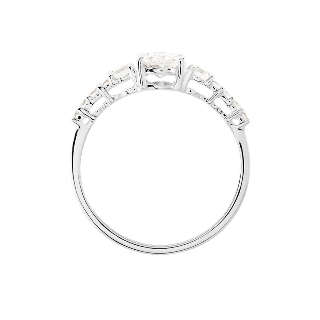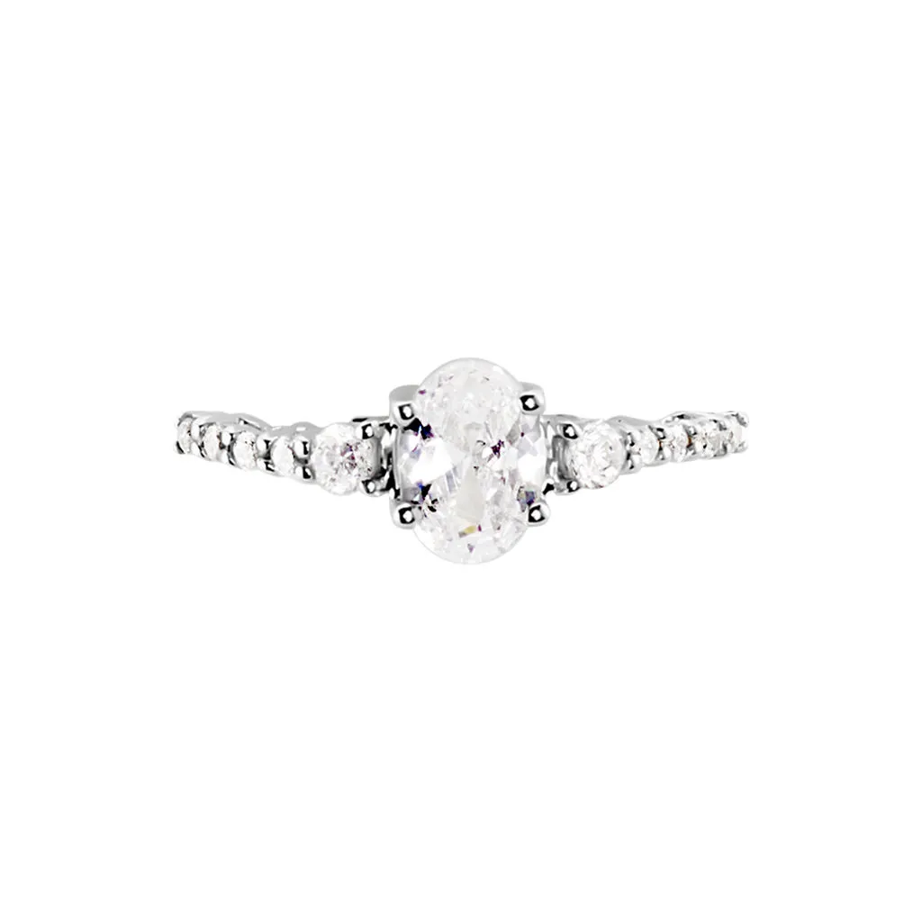 Bague Or Blanc 375/1000 Oxyde De Zirconium Blanc Ovale Central Serti 4 Griffes Accompagne D’oxydes De Zirconium