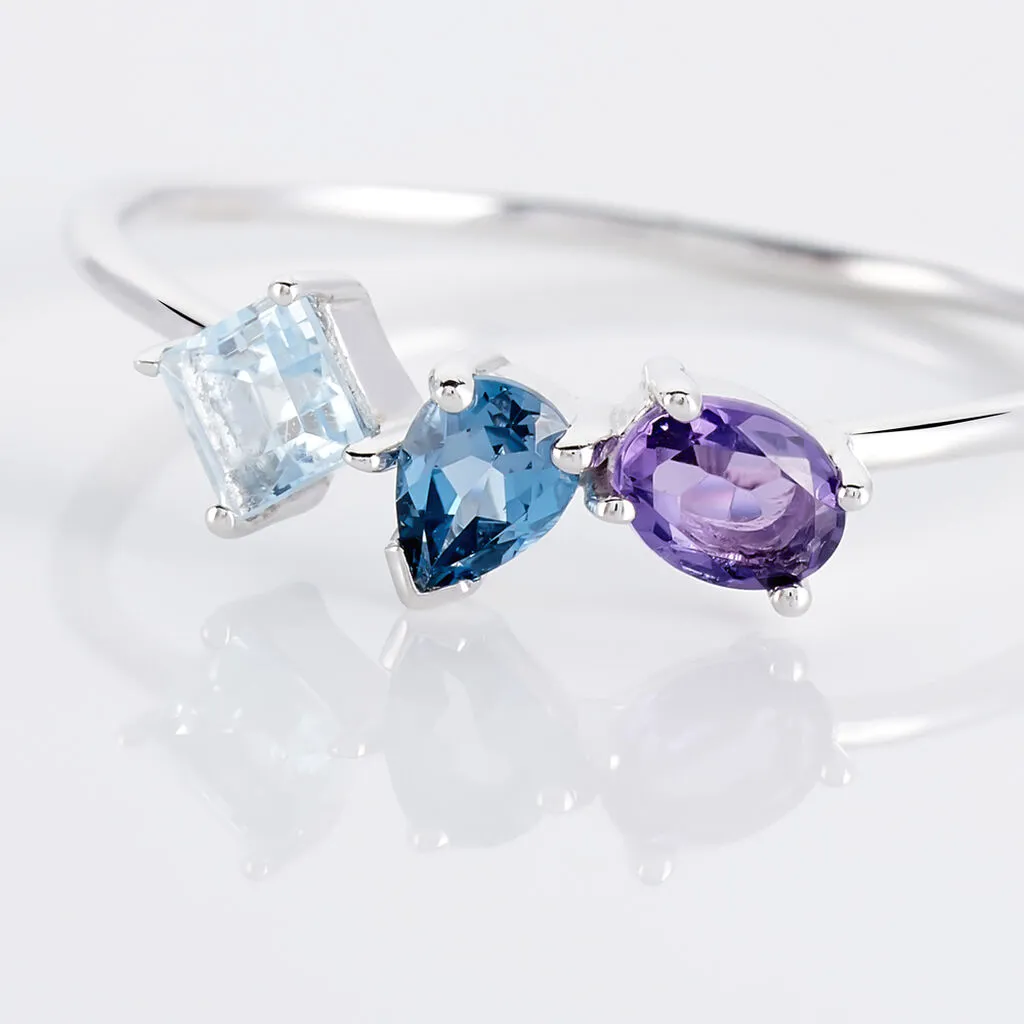 Bague Or Blanc 375/1000 Triple Pierres Serti Griffes Améthyste Topaze Bleu Et Topaze Bleu London