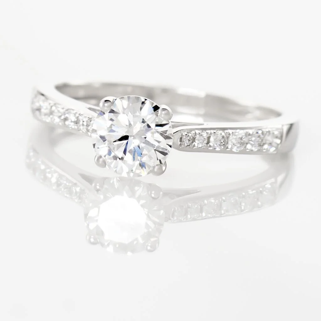Solitaire Or Blanc 750/1000 Diamant Central Synthetique 0.80cts Serti Griffes Accompagne Diamants Synthetique