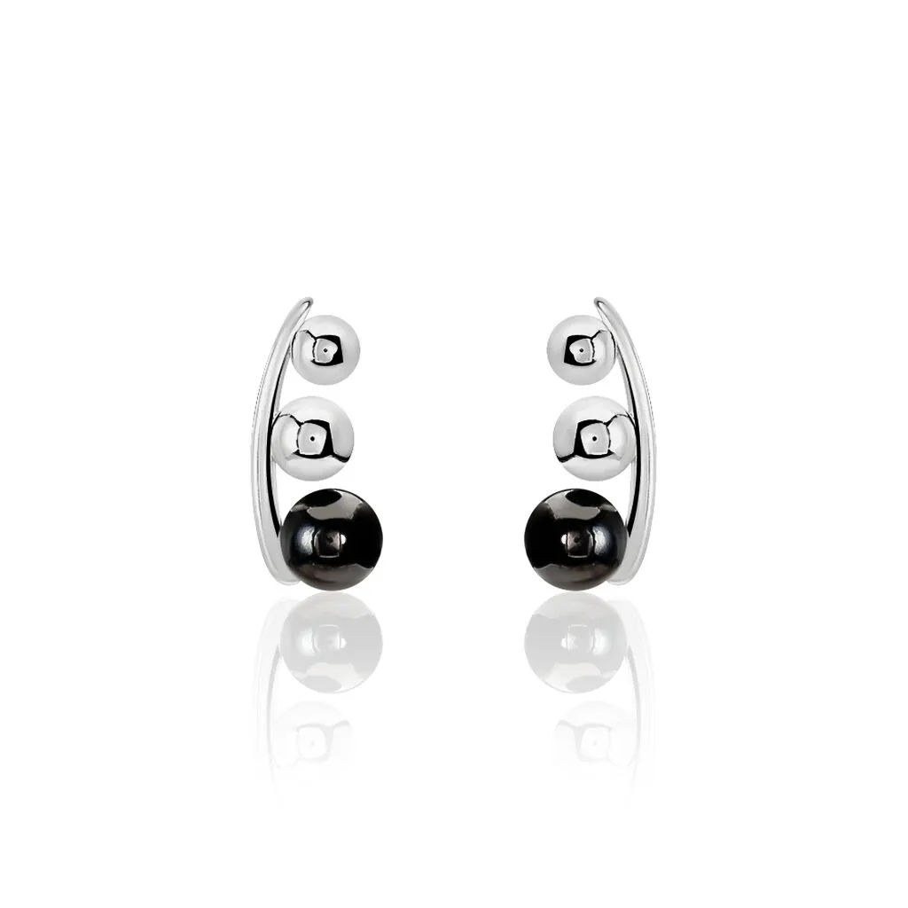 Bijoux D’oreilles Argent Blanc 925/1000 Ear Cuff Boules Ceramique Noire Et Boules Argent