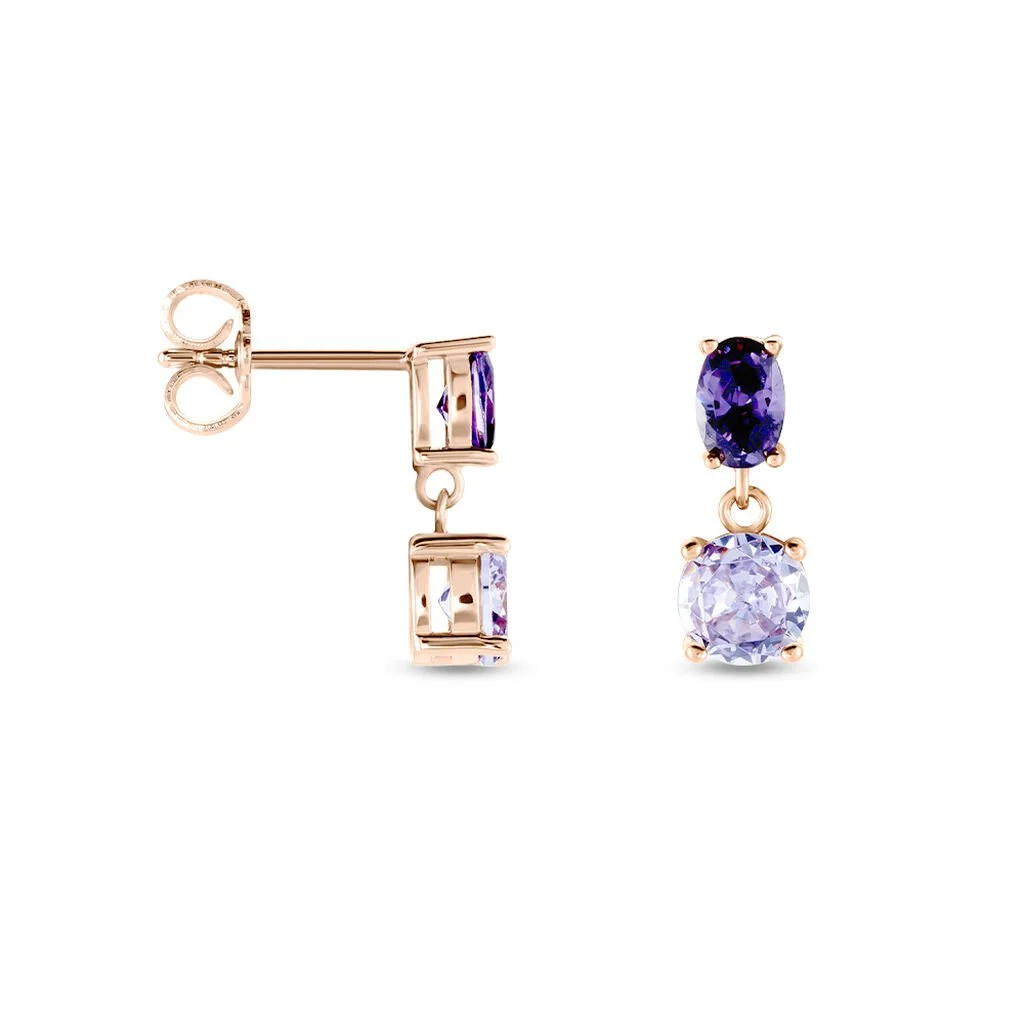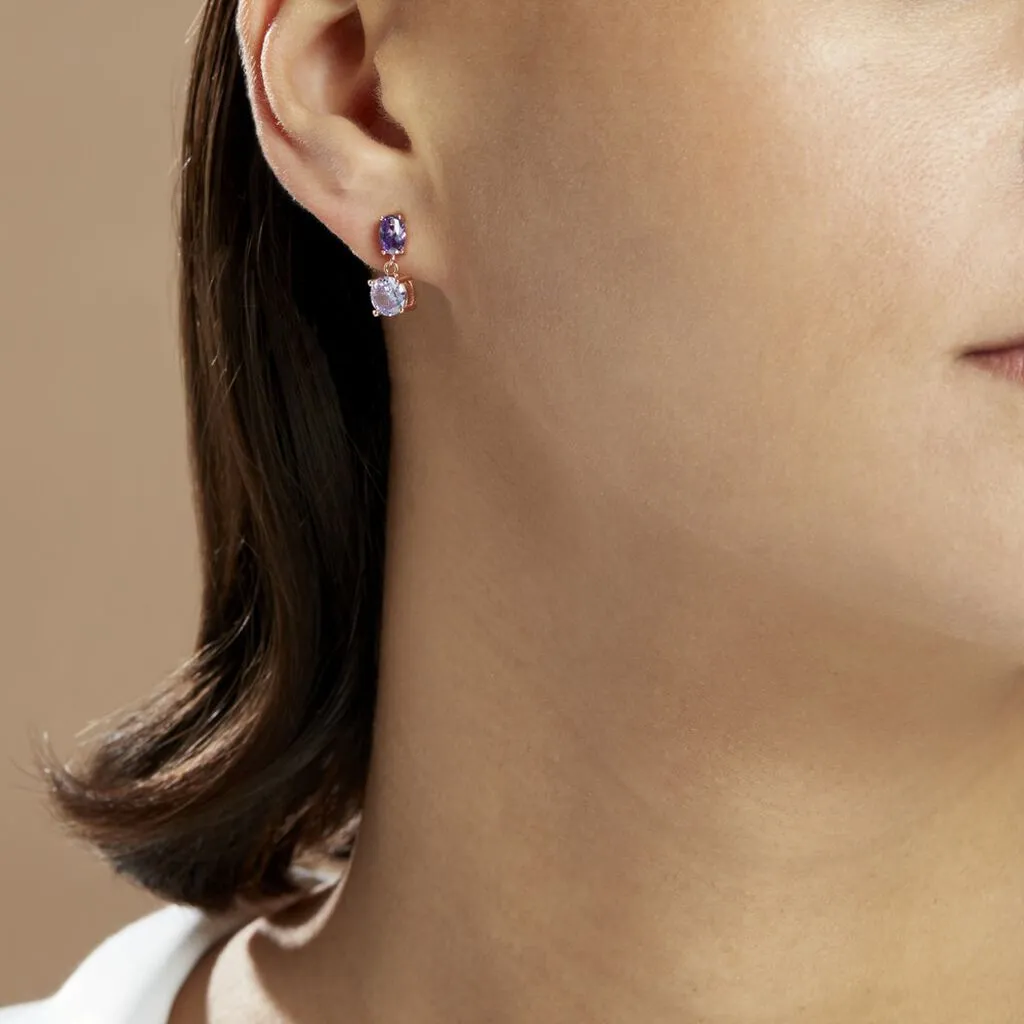 Boucles D’oreilles Pendantes Argent Rose 925/1000 Serti Griffes Oxydes De Zirconium Lavande Et Violet