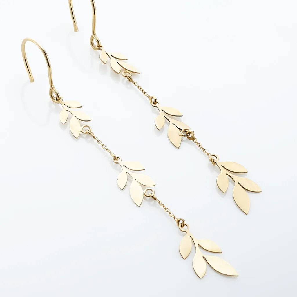 Boucles D’oreilles Or Jaune 375/1000 Pendantes Motif Feuille Chaine Maille Jaseron