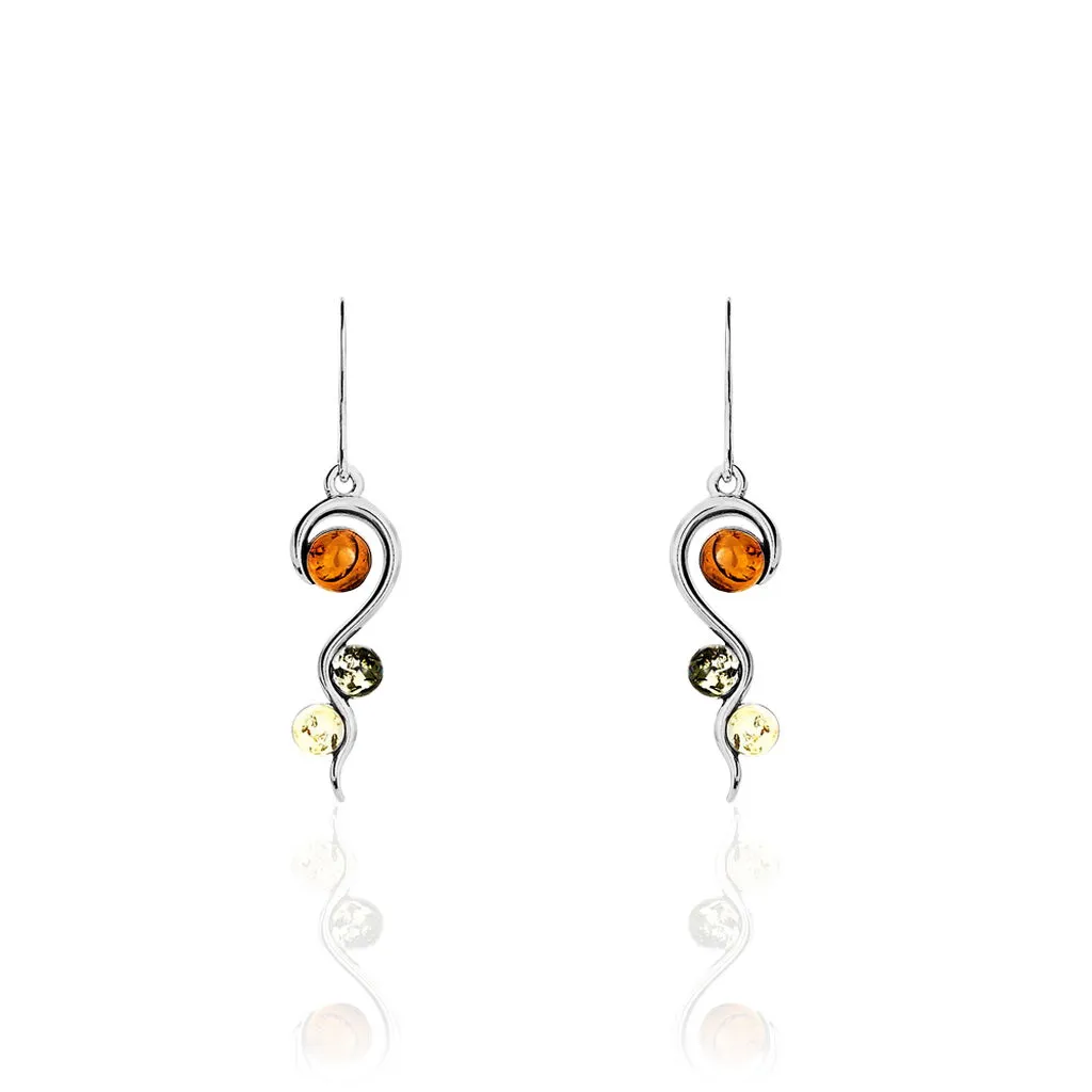 Boucles D’oreilles Pendantes Argent Blanc 925/1000 Ambre Cognac/jaune/verte Music