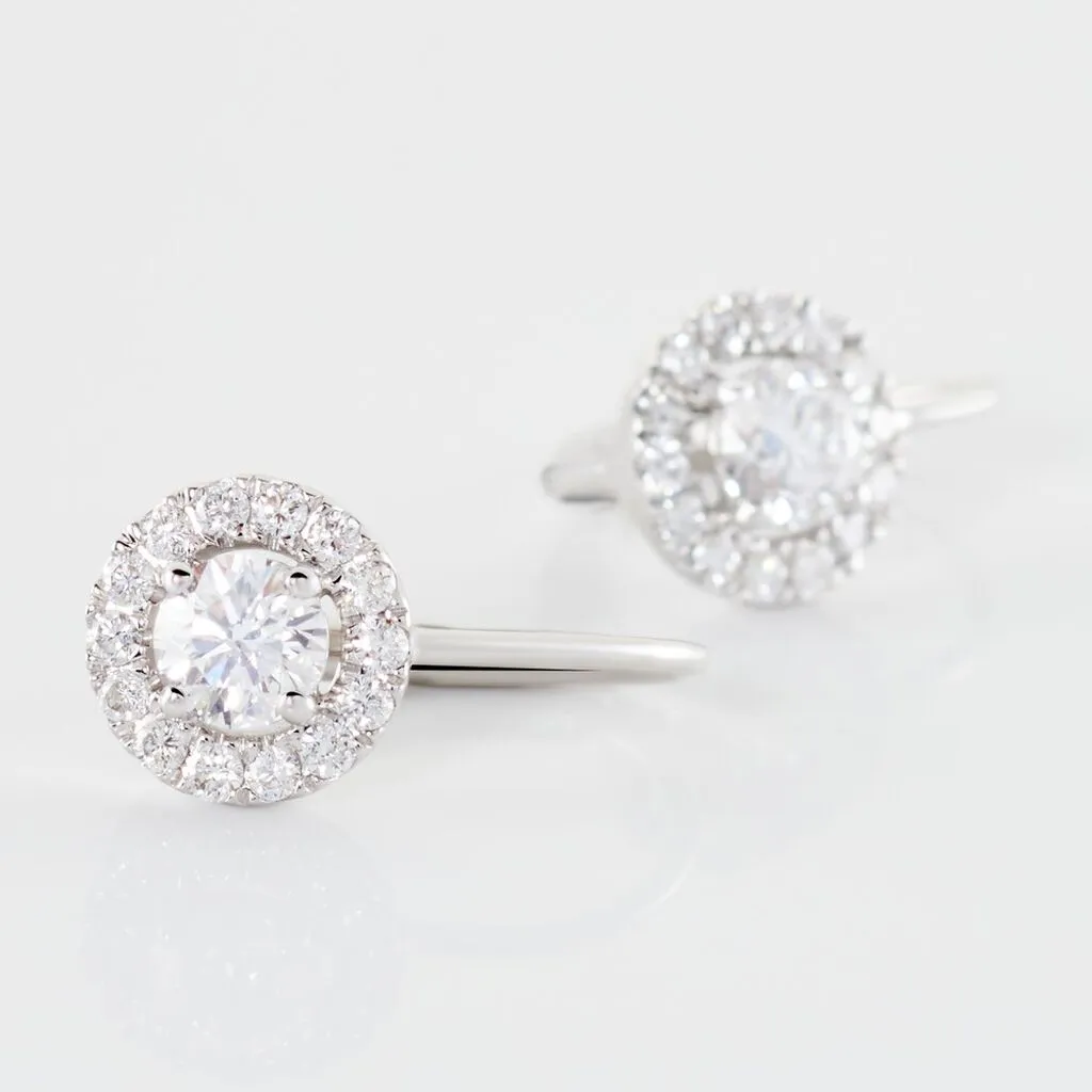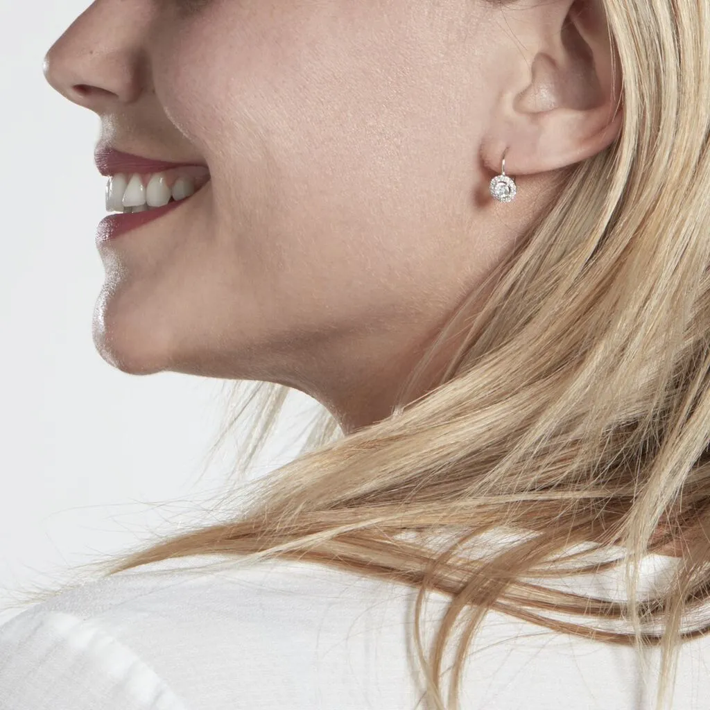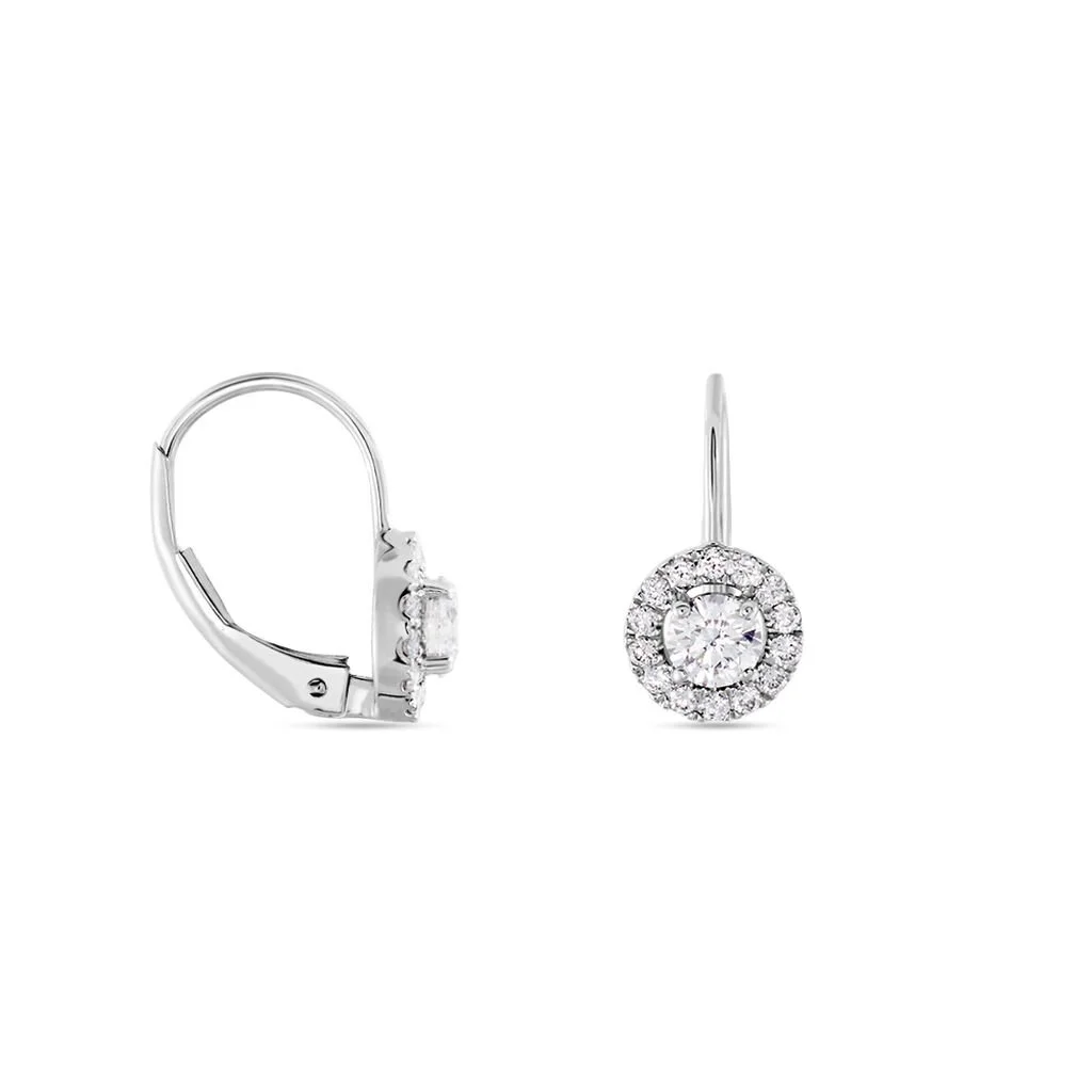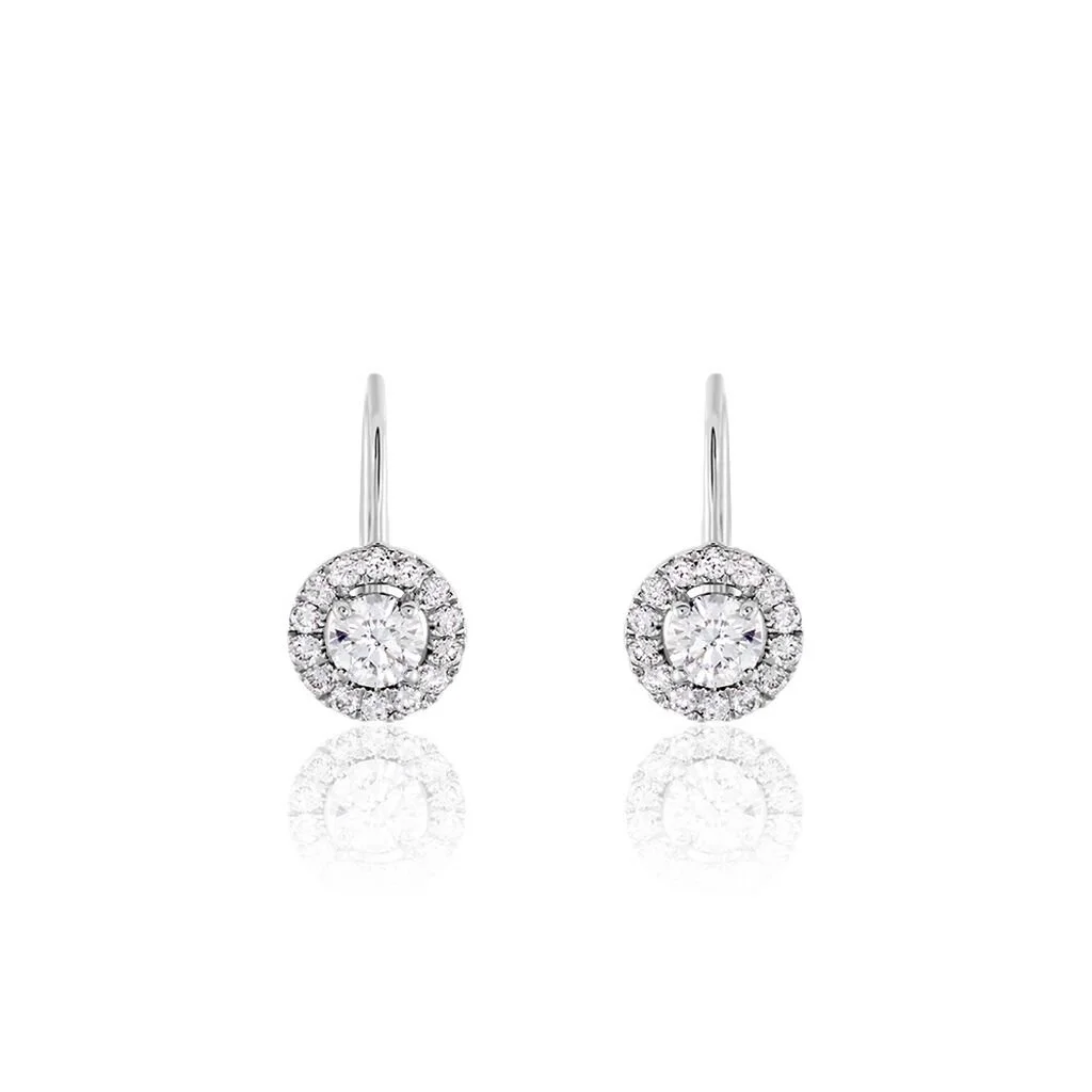 Boucles D’oreilles Pendantes Or Blanc 750/1000 Dormeuses Entourage Forme Ronde Diamants Synthetiques
