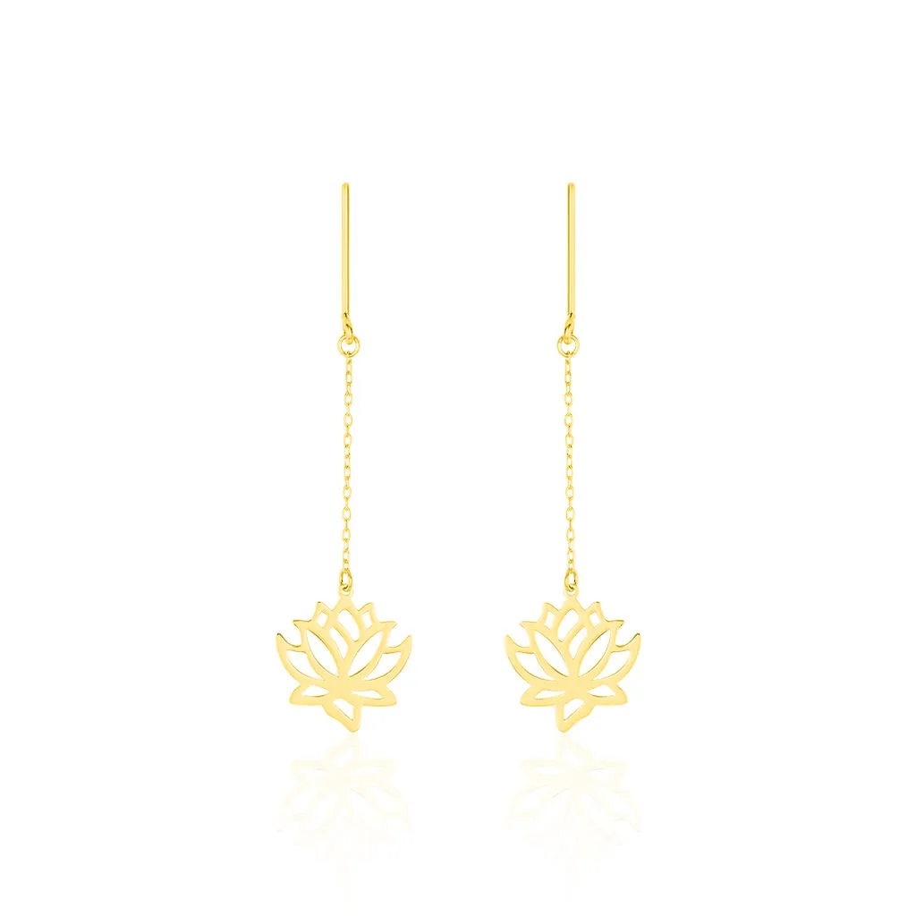 Boucles D’oreilles Or Jaune 375/1000 Pendantes Motifs Fleurs De Lotus