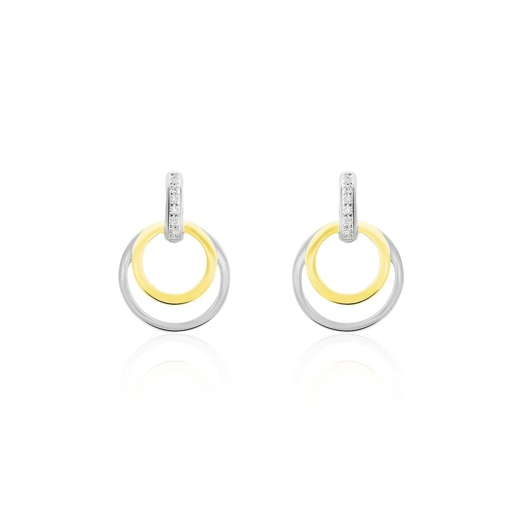 Boucles D’oreilles Pendantes Or 375/1000 Bicolore Blanc Et Jaune Doubles Cercles Ajoures Et Barrettes Pavage Diamants