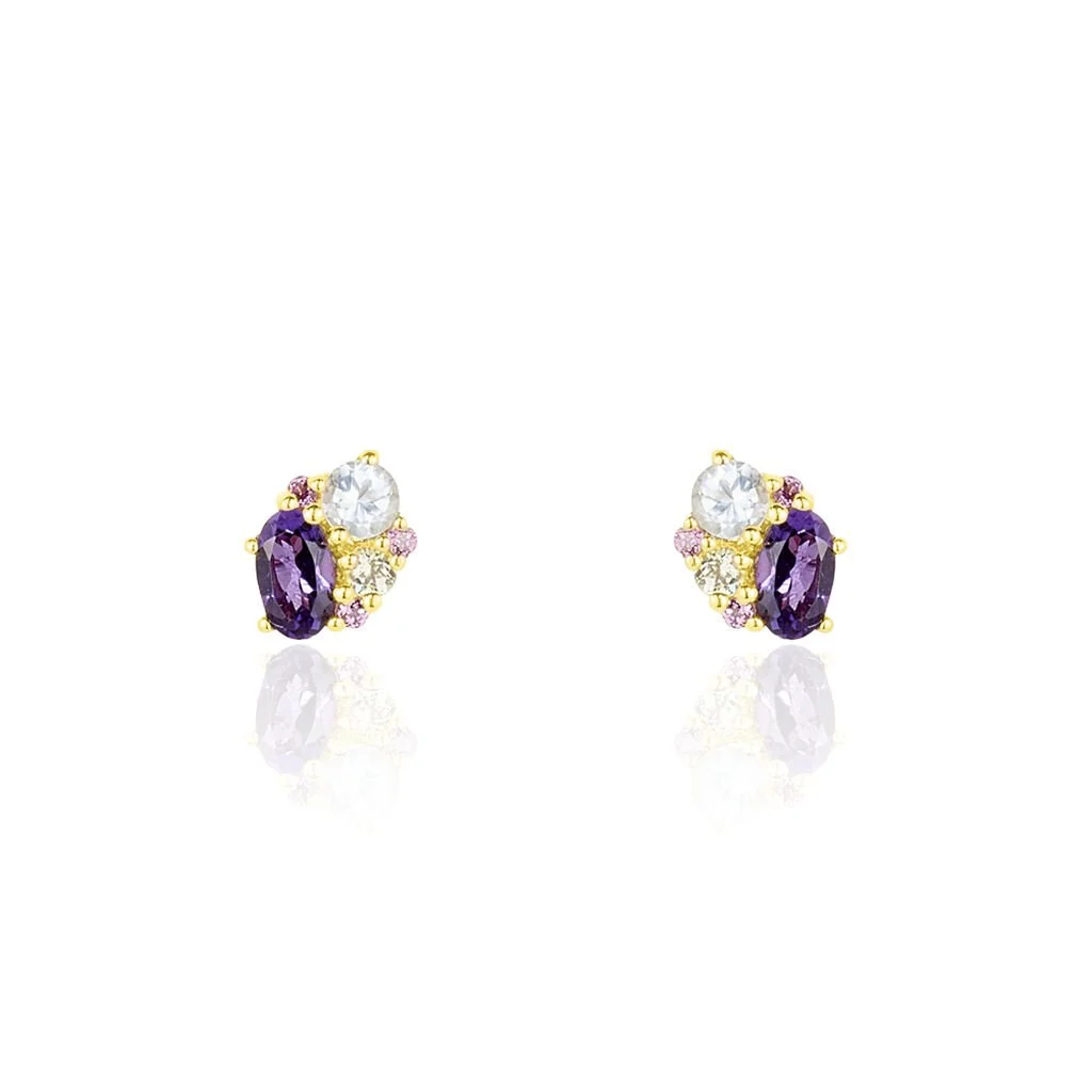 Boucles D’oreilles Or Jaune 375/1000 Jardin Améthystes. Topazes. Péridots Et Rhodolites