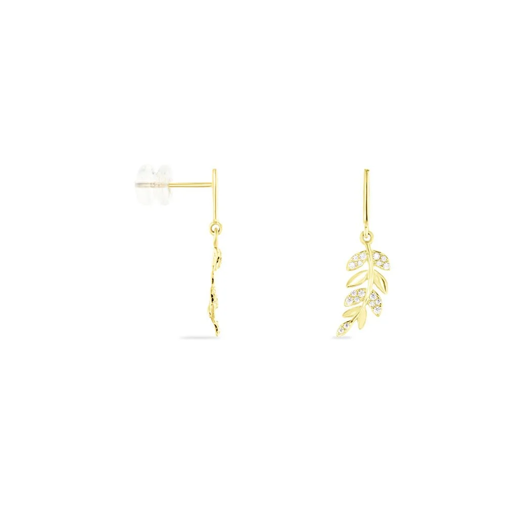 Boucles D’oreilles Pendantes Or Jaune 375/1000 Formes Feuilles Semi Pavages Oxydes De Zirconium