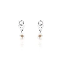 Boucles D’oreilles Argent Blanc 925/1000 2 Anneaux Entrelaces Oxydes De Zirconium Et Perle De Culture 5.5mm