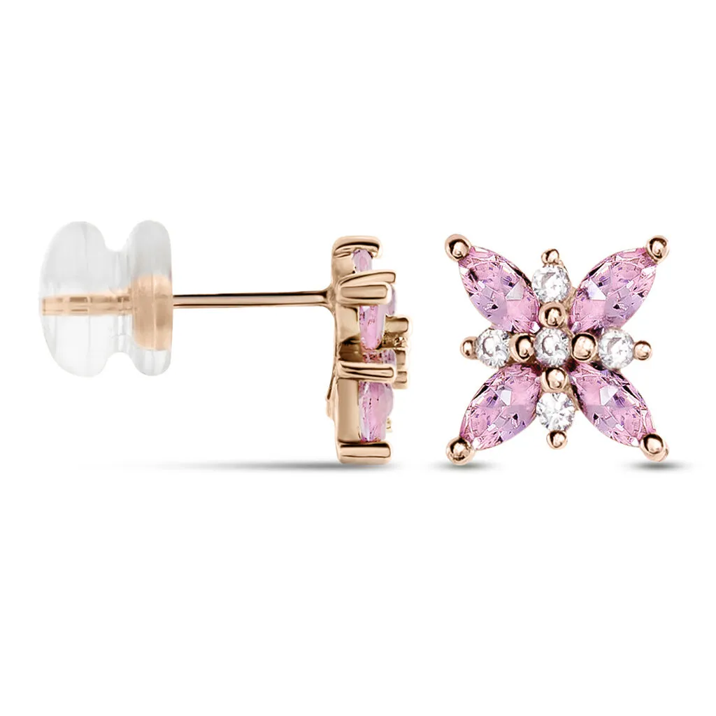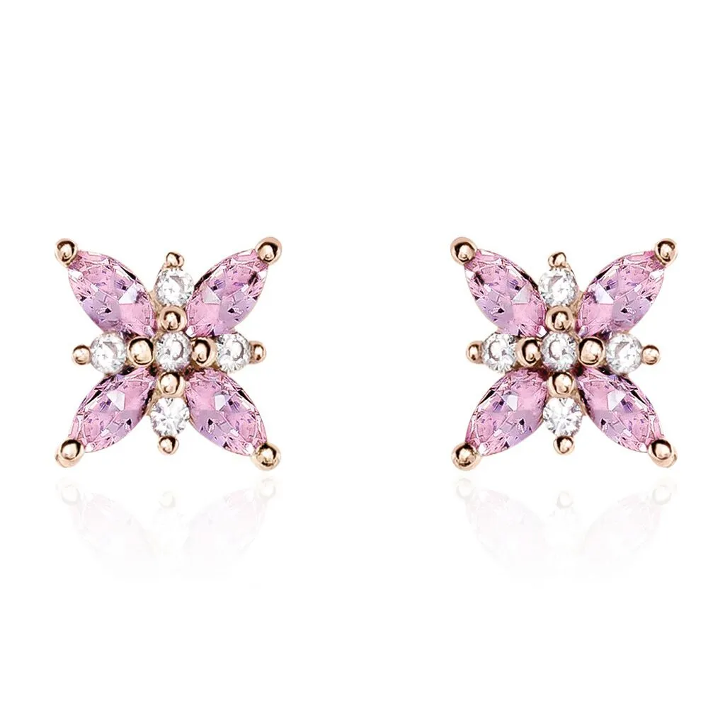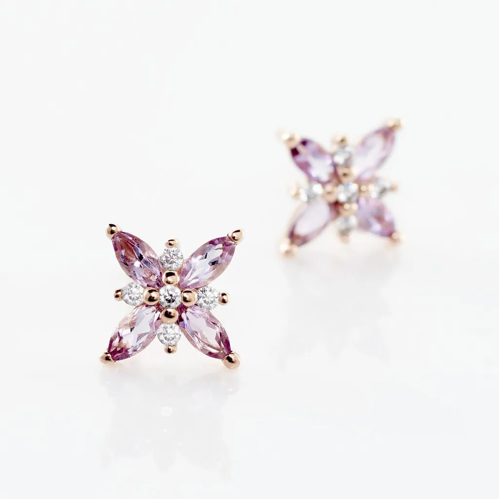 Boucles D’oreilles Puces Or Rose 375/1000 Motif Fleur Améthyste Violet Sertis Griffes Oxydes De Zirconium Blanc
