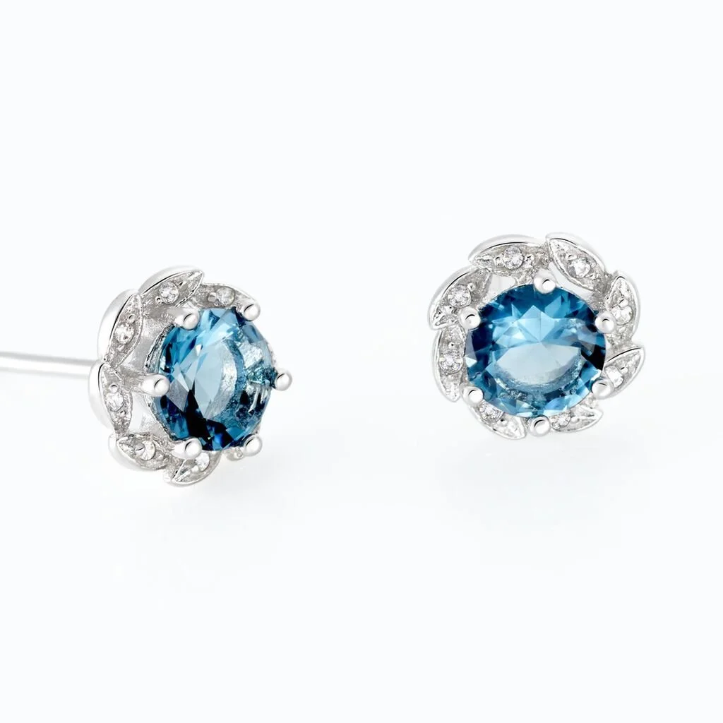 Boucles D’oreilles Puces Argent Blanc 925/1000 Fleur En Verre Bleu Serti 6 Griffes Et Oxydes De Zirconium