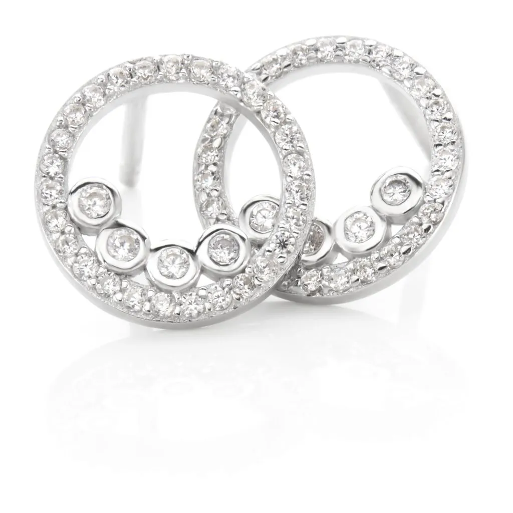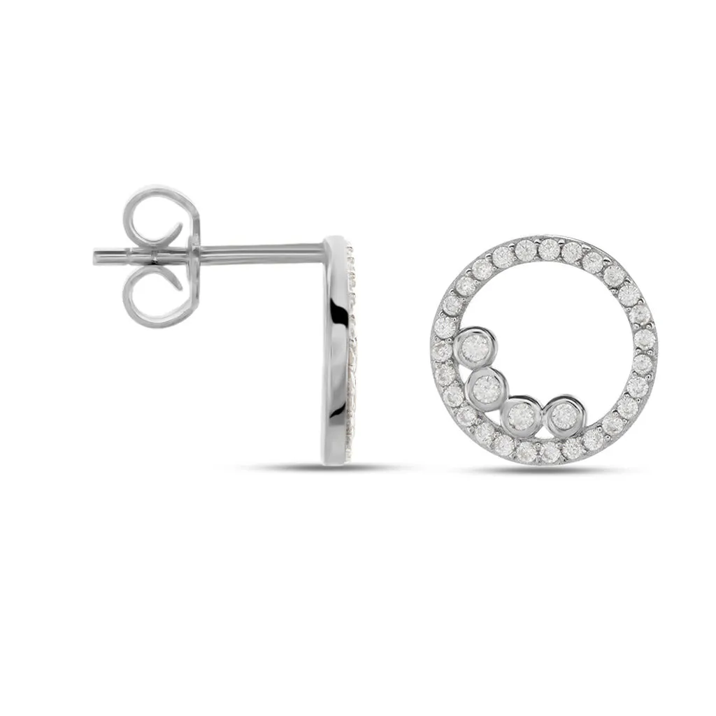 Boucles D’oreilles Puces Argent Blanc 925/1000 Cerles Pavage Et Serti Clos Oxydes De Zirconium