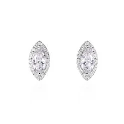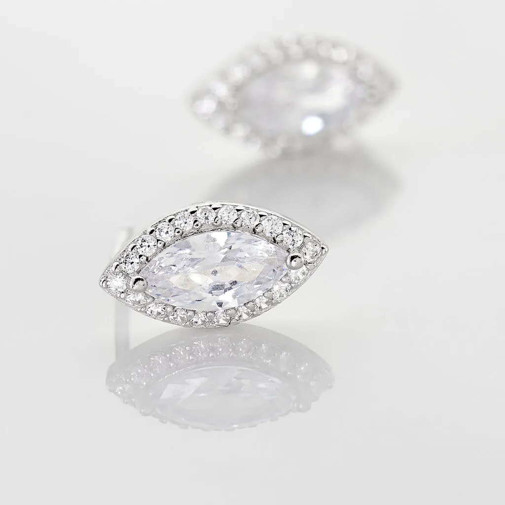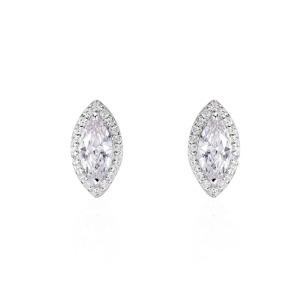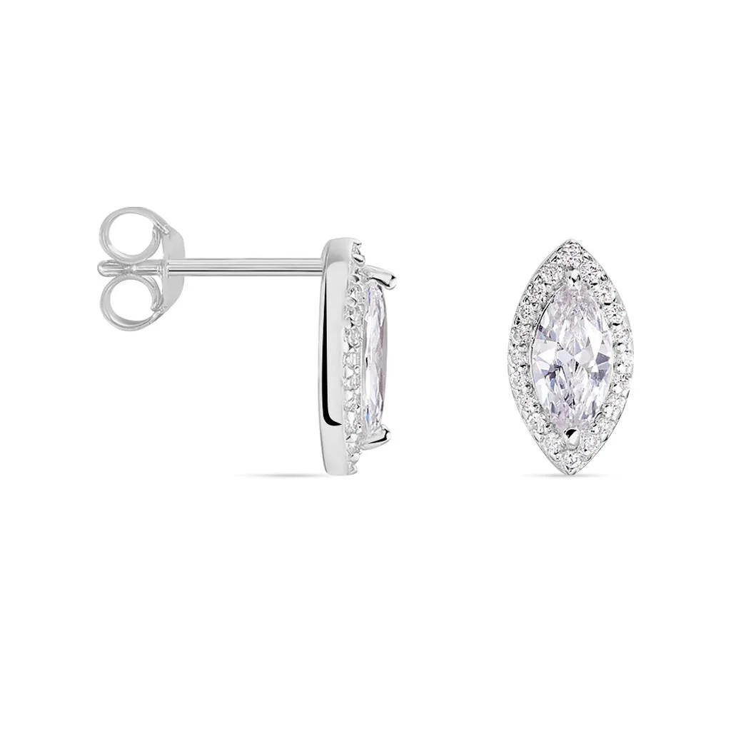 Boucles D’oreilles Puces Argent Blanc 925/1000 Navettes Entourage Sertis Griffes Oxydes De Zirconium