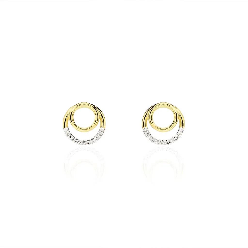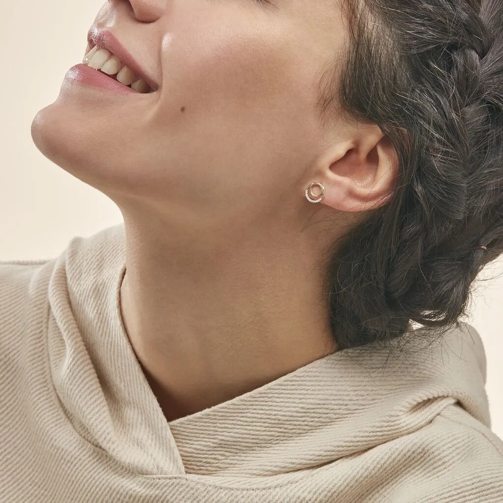 Boucles D’oreilles Or Jaune 375/1000 Double Cercle Ajoure Semi Pavage Diamants