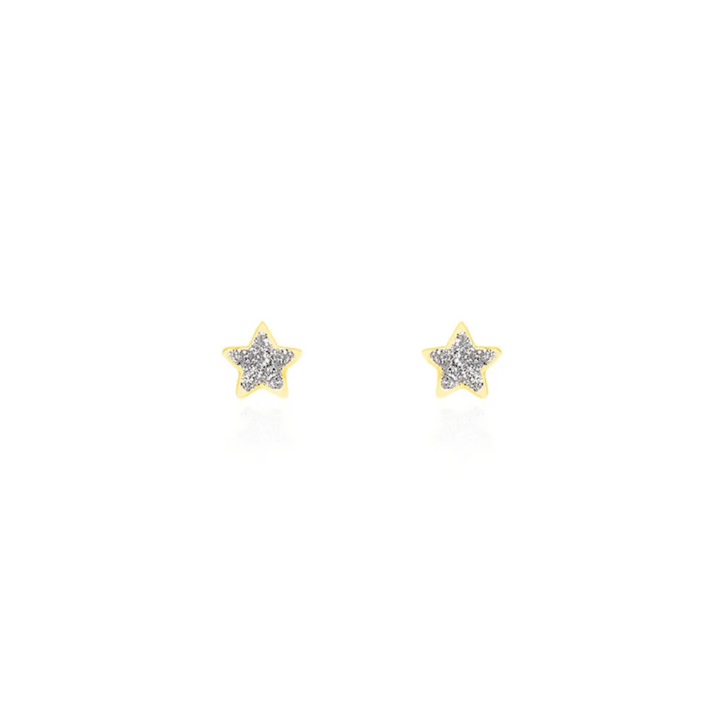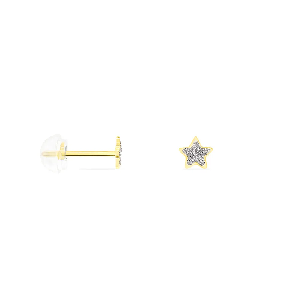Boucles D’oreilles Or Jaune 375/1000 Puces Motifs Etoiles Glitter Silver