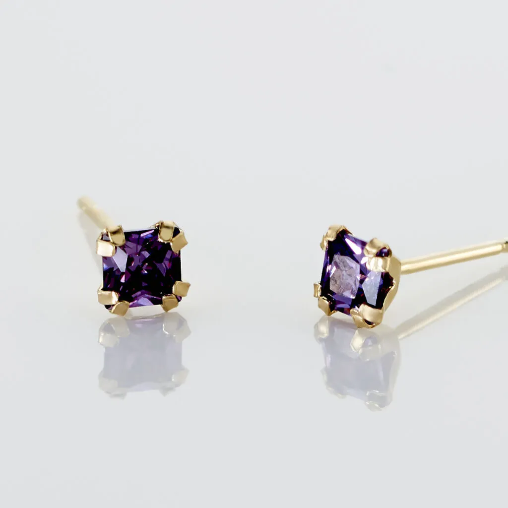 Boucles D’oreilles Or Jaune 375/1000 Puce Oxydes De Zirconium Violets Carres 3mm