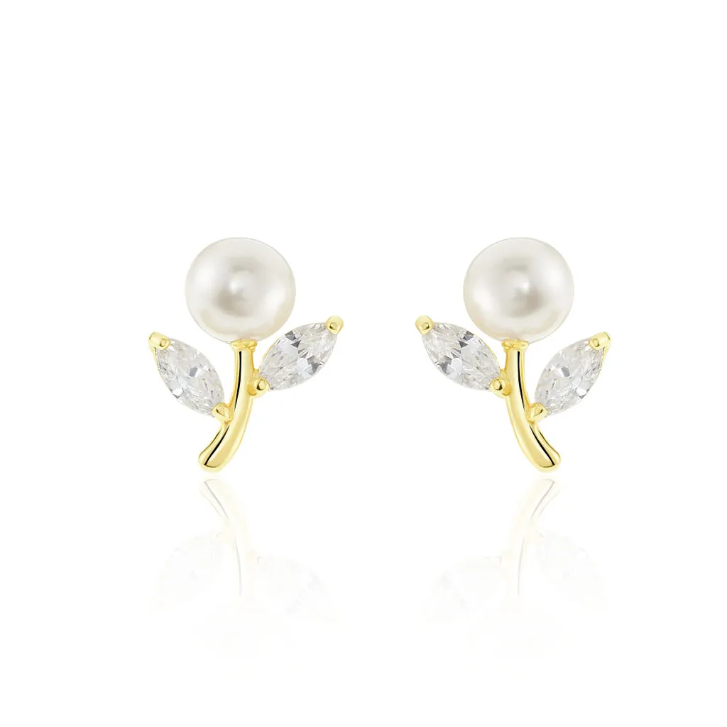 Boucles D’oreilles Or Jaune 375/1000 Motifs Feuilles Oxydes De Zirconium Et Perles De Culture 4mm