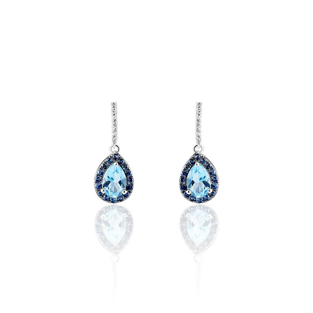 Boucles D’oreilles Or Blanc 375/1000 Topazes Forme Poires Entourage Saphirs Et Pavage Diamants