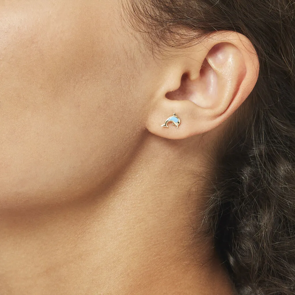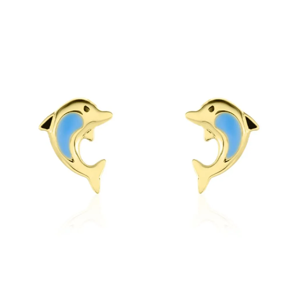 Boucles D’oreilles Or Jaune 375/1000 Puce Dauphin Smalto Bleu