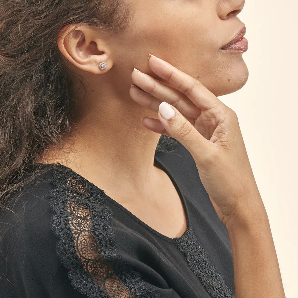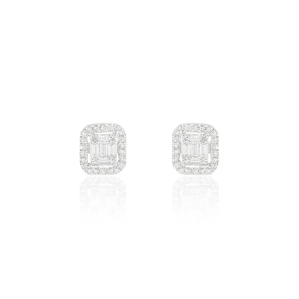 Boucles D’oreilles Or Blanc 375/1000 Puces Formes Carrées Diamants Baguettes 0.18cts