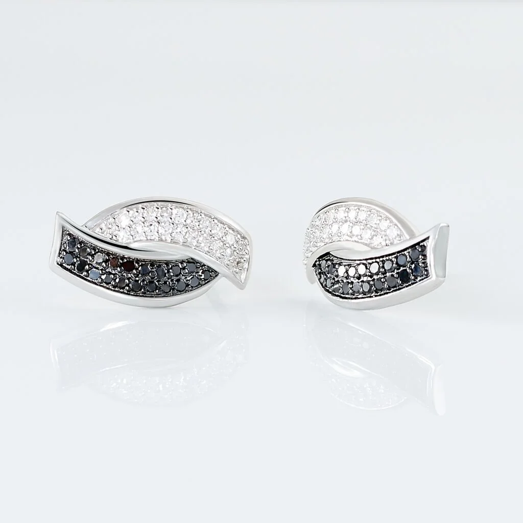 Boucles D’oreilles Or Blanc 375/1000 Puces Formes Croisées Diamants Noirs Et Diamants Blancs