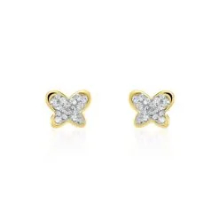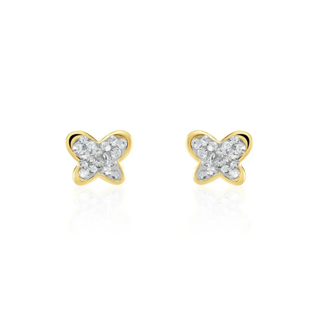 Boucles D’oreilles Puces Or Jaune 750/1000 Papillons Strass Fermoirs Vis