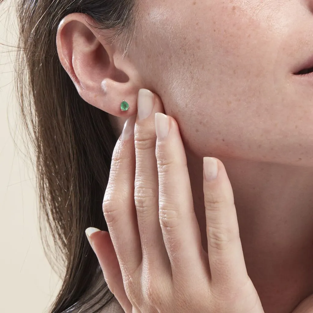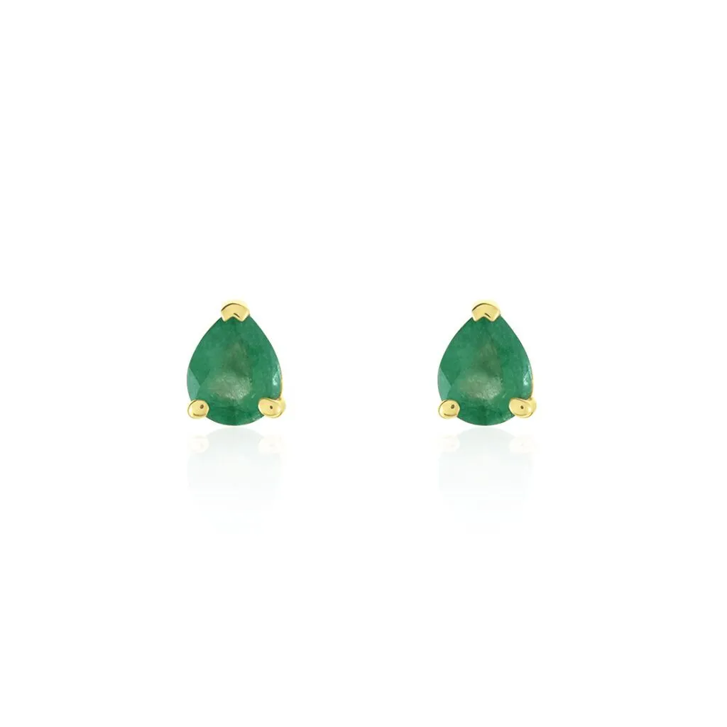 Boucles D’oreilles Puces Or Jaune 375/1000 Emeraude Poire Serti Griffes 0.6ct
