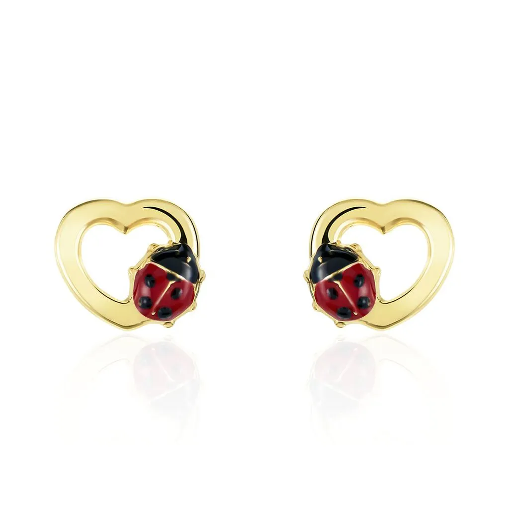 Boucles D’oreilles Puces Or Jaune 750/1000 Coeurs Et Coccinelles Smalto Rouge Fermoirs Vis
