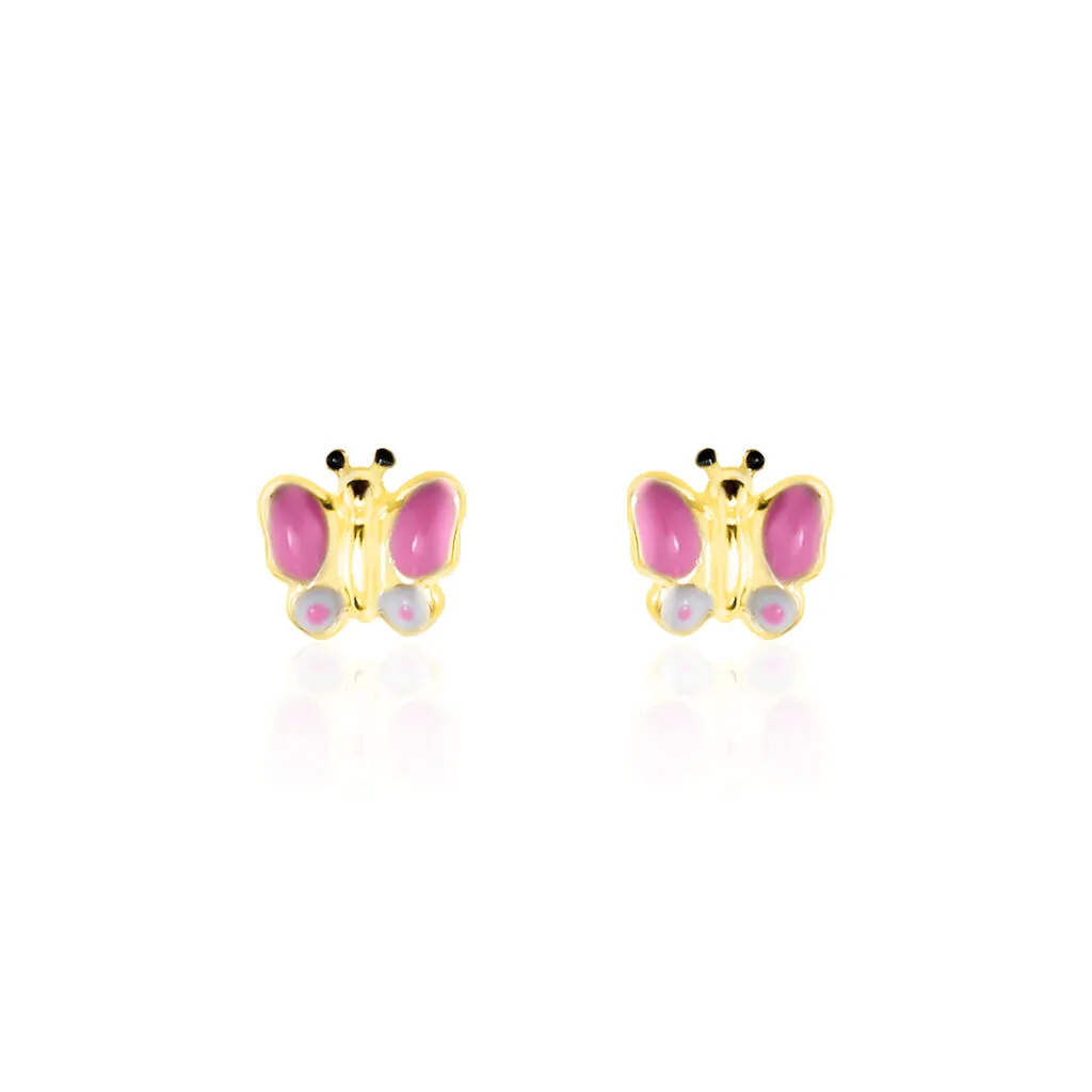 Boucles D’oreilles Or Jaune 375/1000 Papillon Smalto Rose