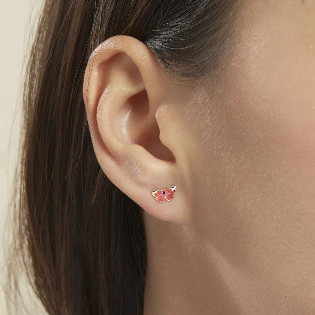Boucles D’oreilles Or Jaune 375/1000 Puces Papillons Smalto Fushia