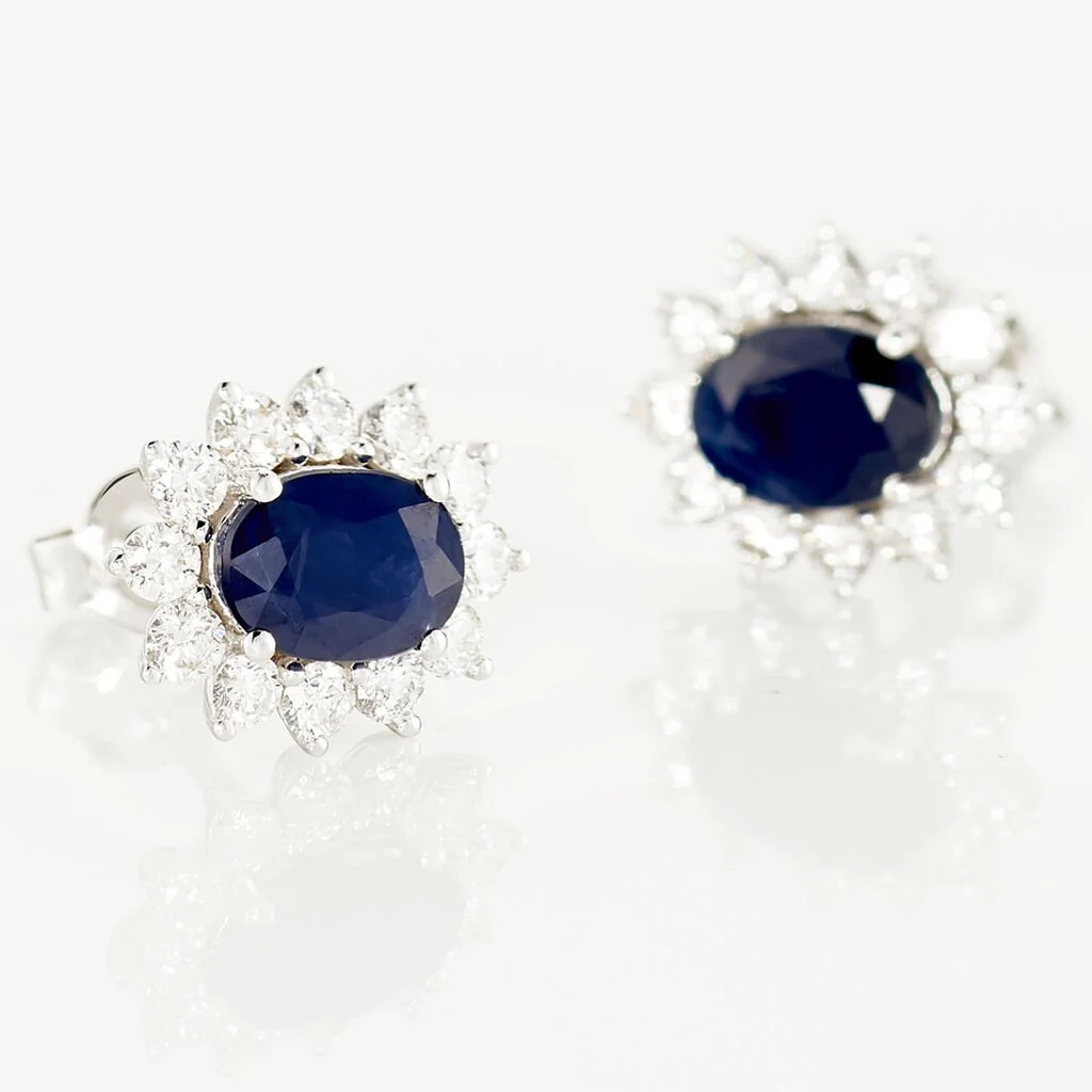 Boucles D’oreilles Or Blanc 375/1000 Saphir Simple Entourage Diamants Blancs Vassili Mm