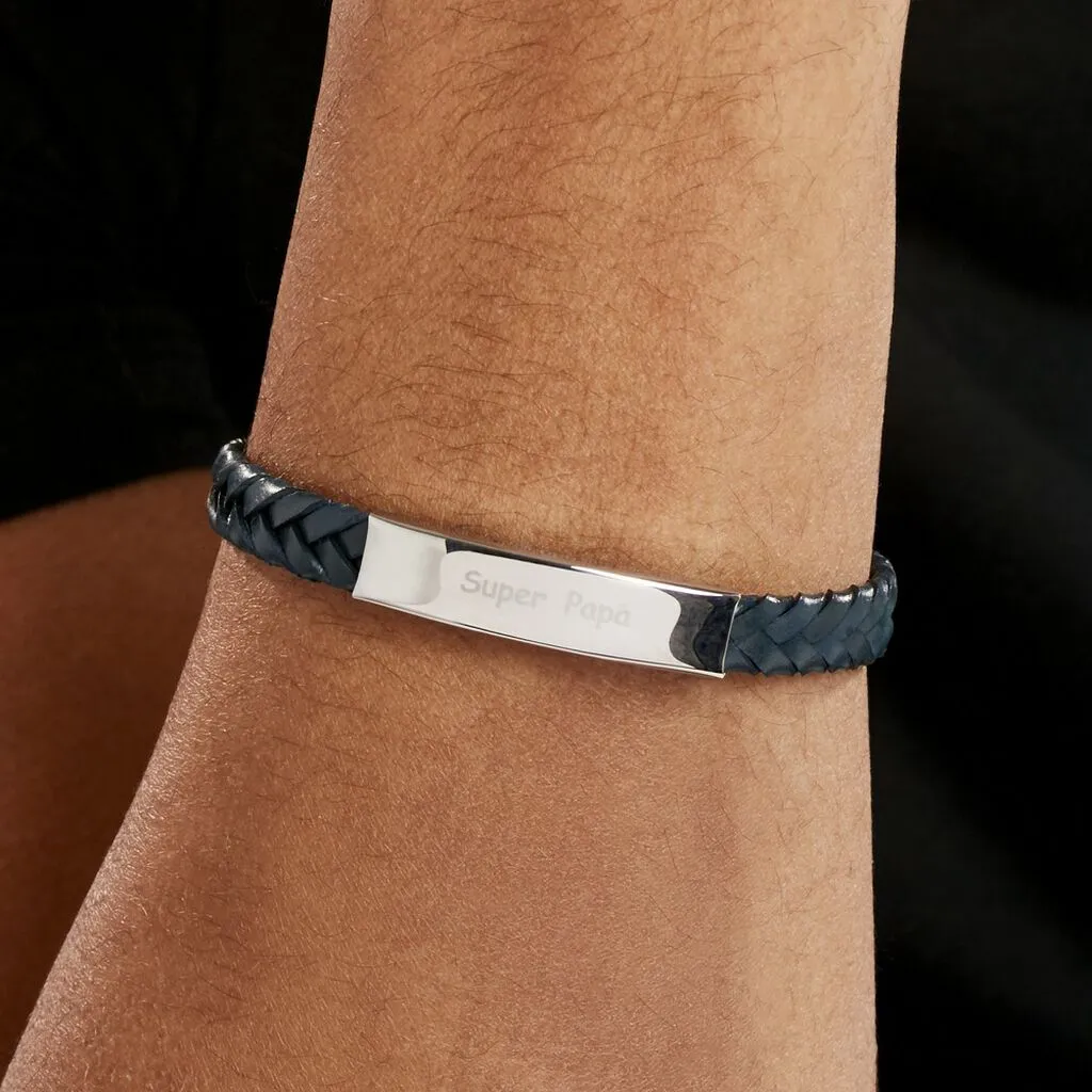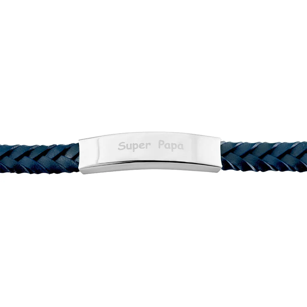 Bracelet Acier Blanc Tressé Cuir De Vache Bleu Plaque Message Super Papa 21cm