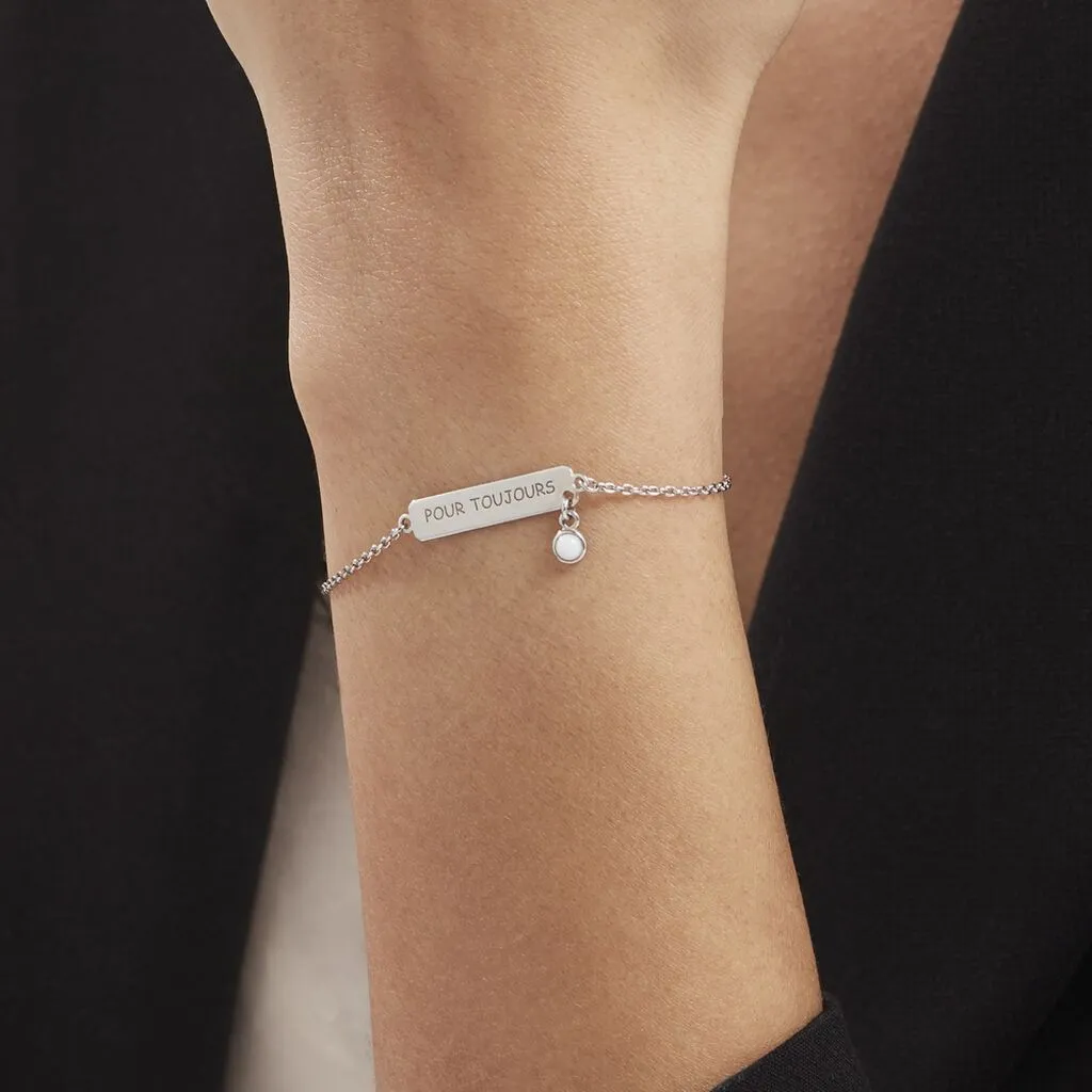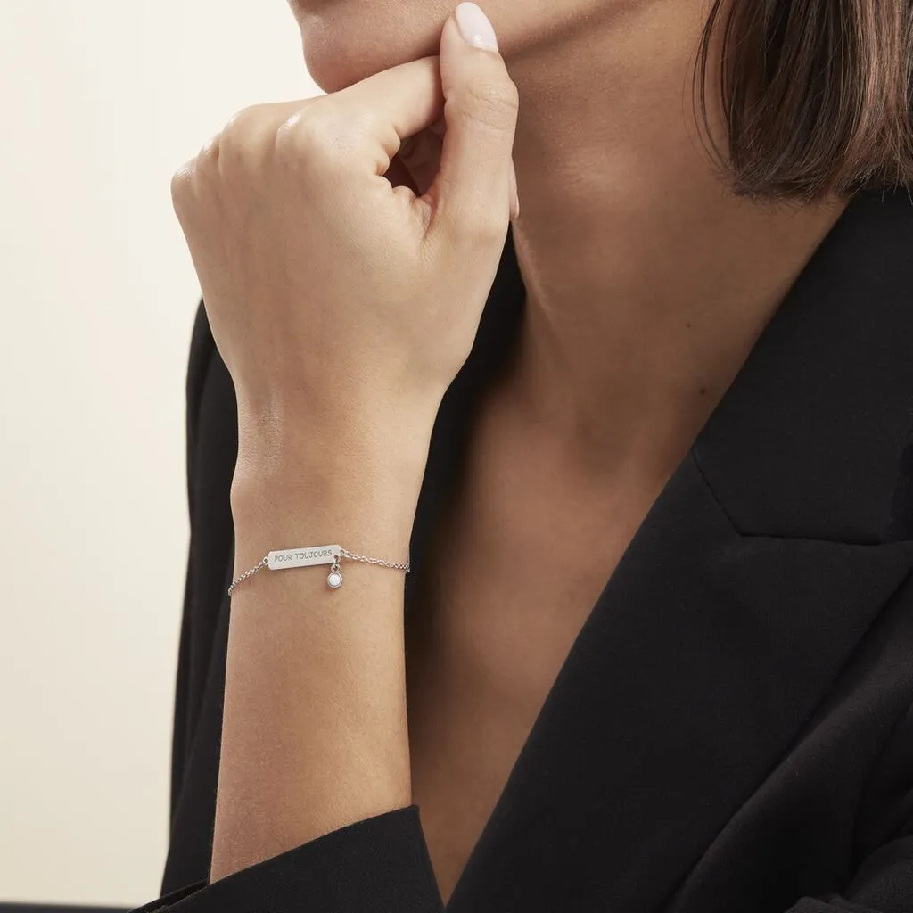 Bracelet Argent Blanc 925/1000 Barrette Message Pour Toujours Pampille Agate Blanche Maille Forcat Largeur 1.3mm 19cm