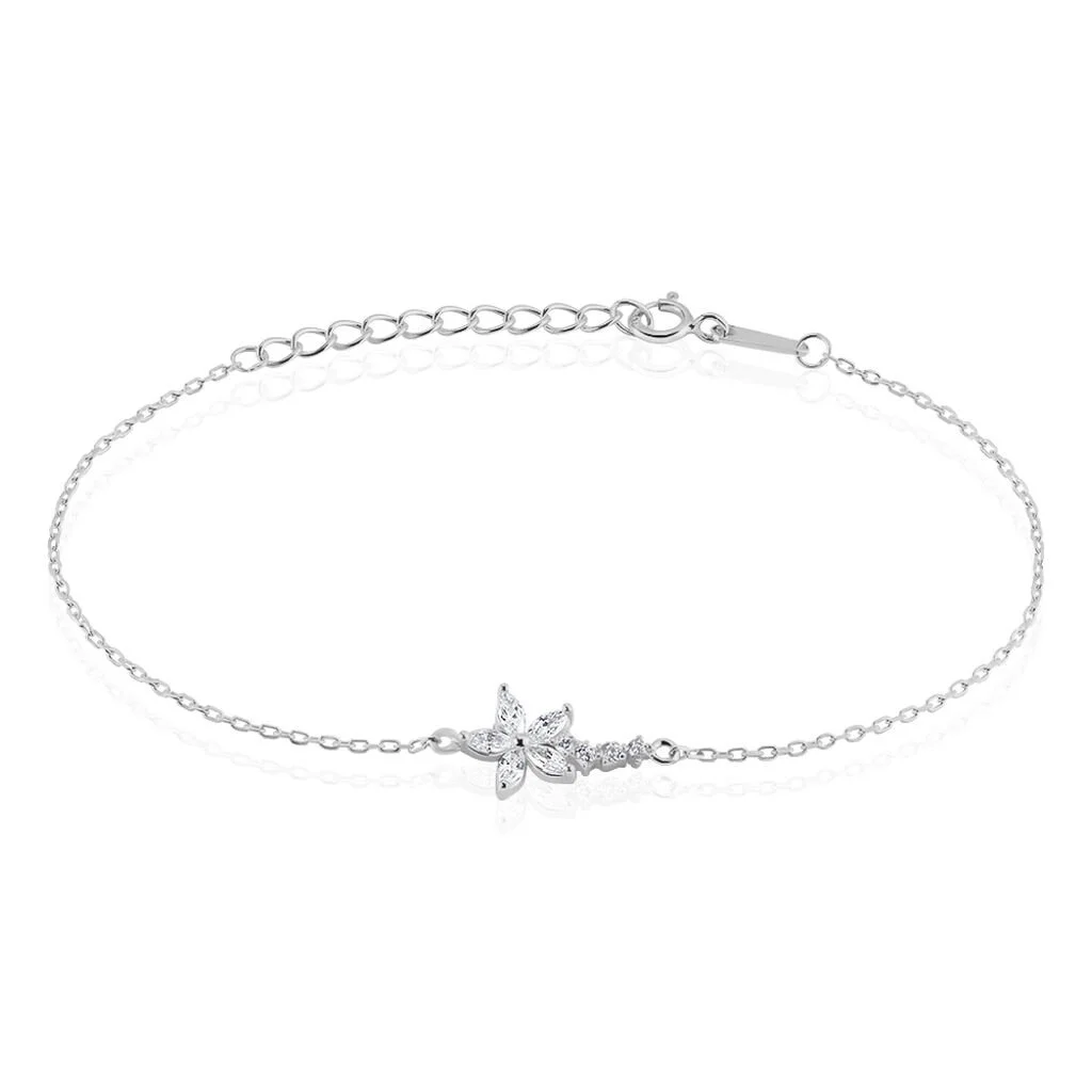 Bracelet Argent Blanc 925/1000 Fleur Sertis Griffes Oxydes De Zirconium Navettes Maille Forçat 19cm