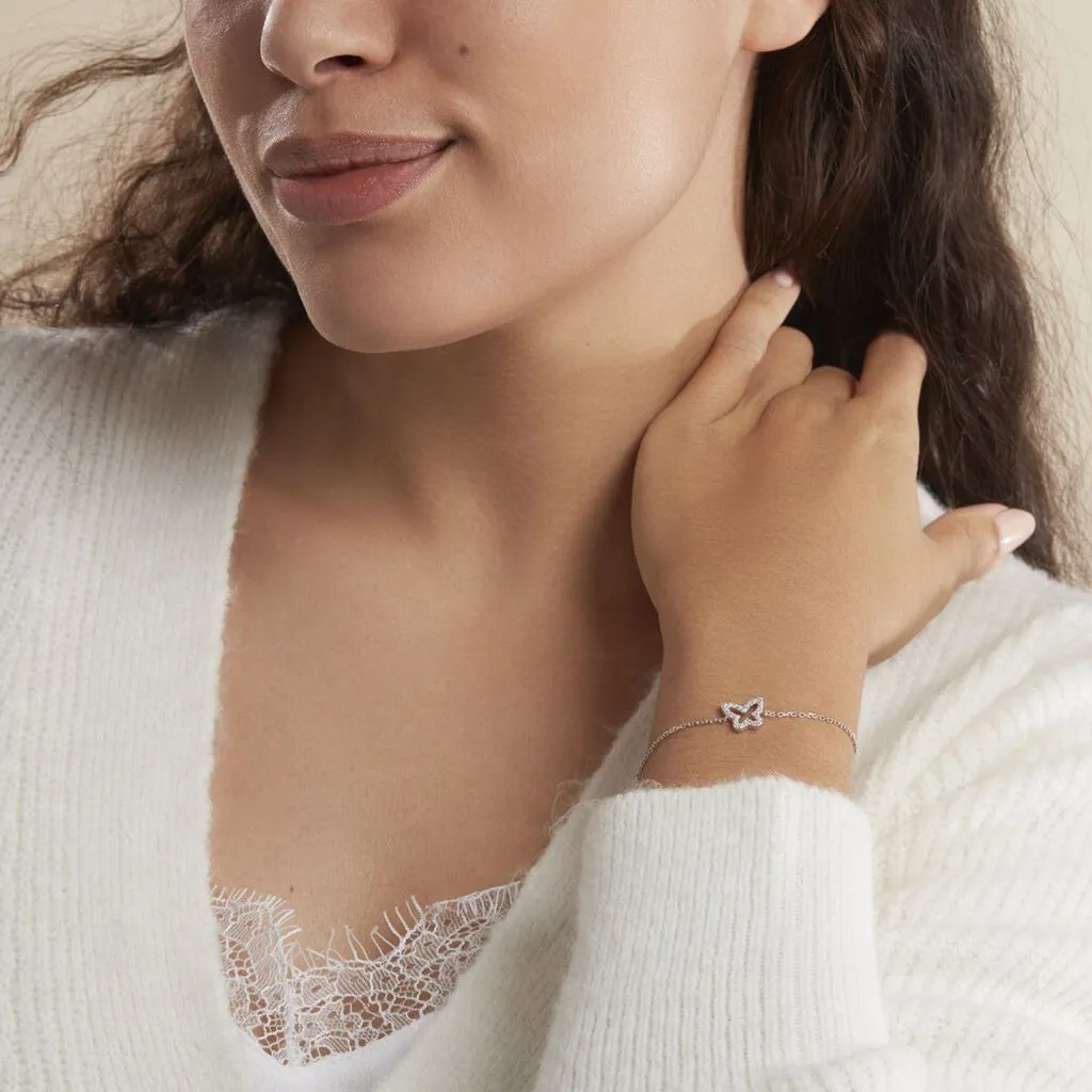 Bracelet Argent Blanc 925/1000 Forme Papillon Ajouré Oxydes De Zirconium Maille Forçat 19cm