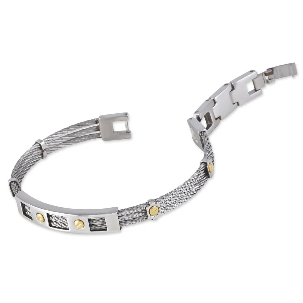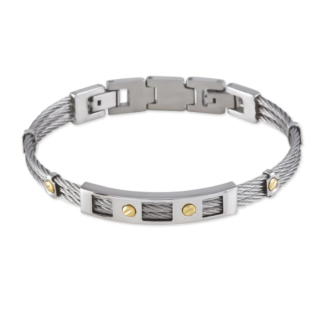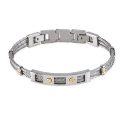 Bracelet Acier Blanc Cable Vis Plaque Or Jaune 20cm