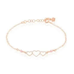 Ce bracelet en argent rose 925/1000ème s’accorde avec toutes les tenues. Le modèle est caractérisé par deux oxydes de Zirconium roses placés des deux côtés du motif formé par trois cœurs ajourés. Une jolie breloque trèfle décore son fermoir anneau ressort. Ce modèle existe aussi dans une autre couleur.