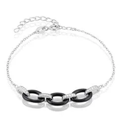 Bracelet Argent Blanc 925/1000 Ceramique Noire 3 Maillons Ovales Avec Oxyde De Zirconium 19cm
