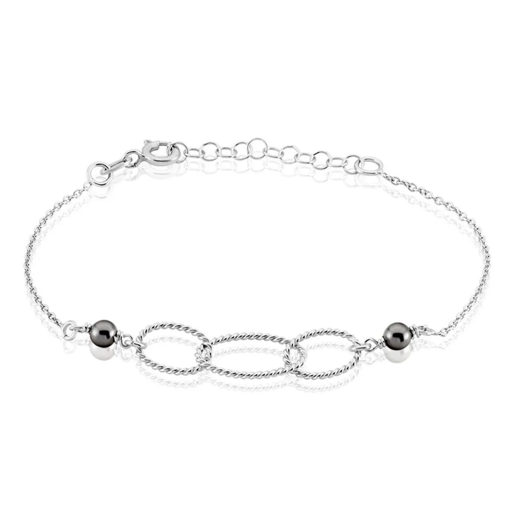 Bracelet Argent Blanc 925/1000 Ovales Effets Torsades Perles D’imitation Noires Maille Forcat 18.5cm