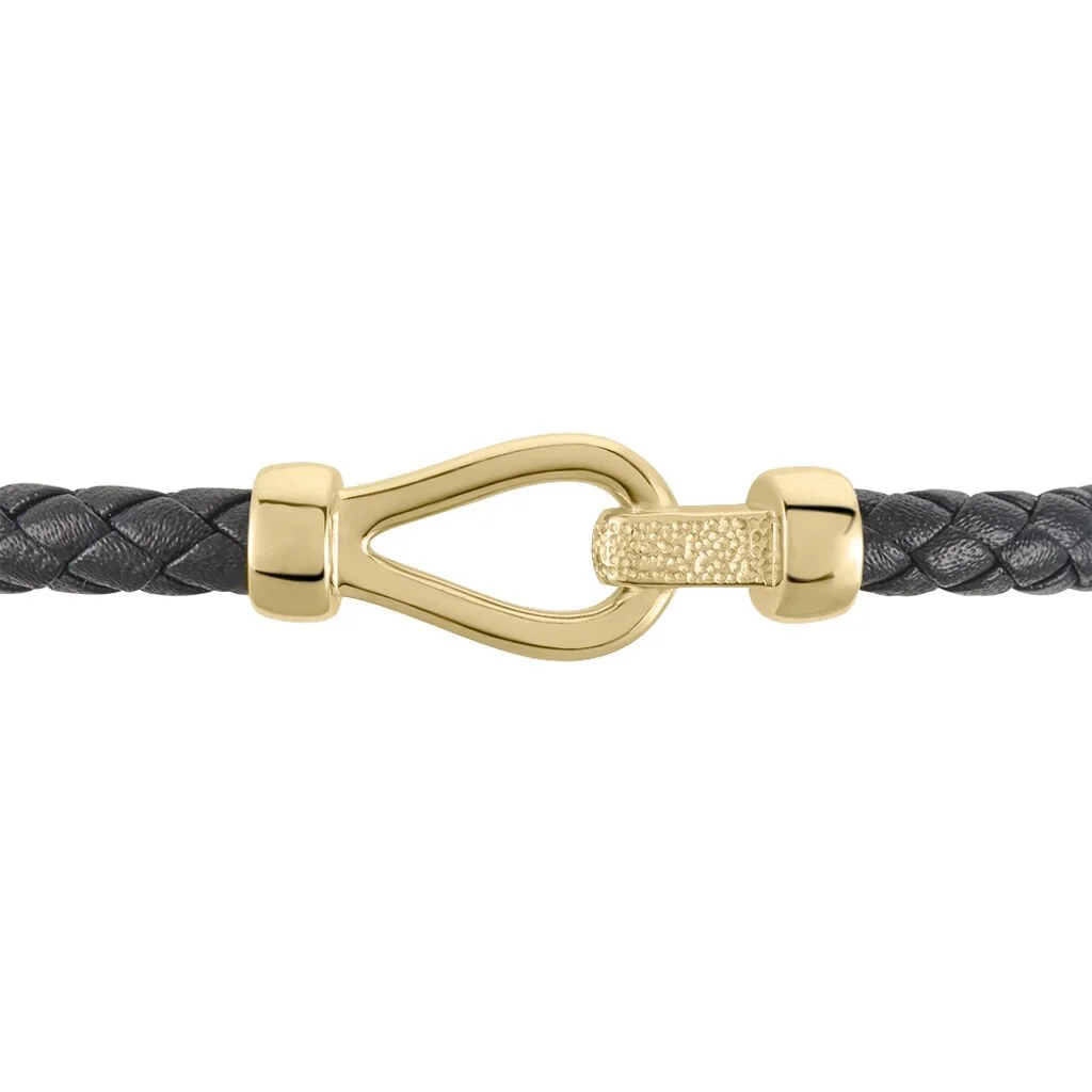 Bracelet Plaque Or Jaune Maillon Cordon Tresse Cuir Noir 21cm