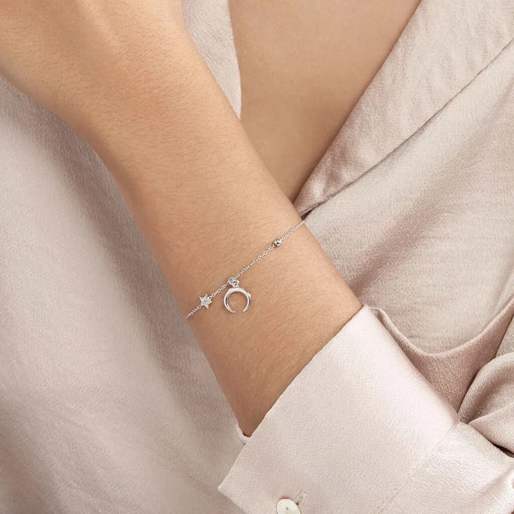 Bracelet Argent Blanc 925/1000 Pampille Corne Etoile Avec Oxyde De Zirconium Et Boules Maille Forcat 18.5cm