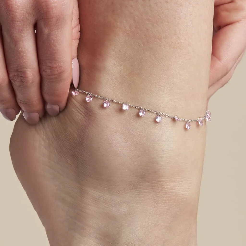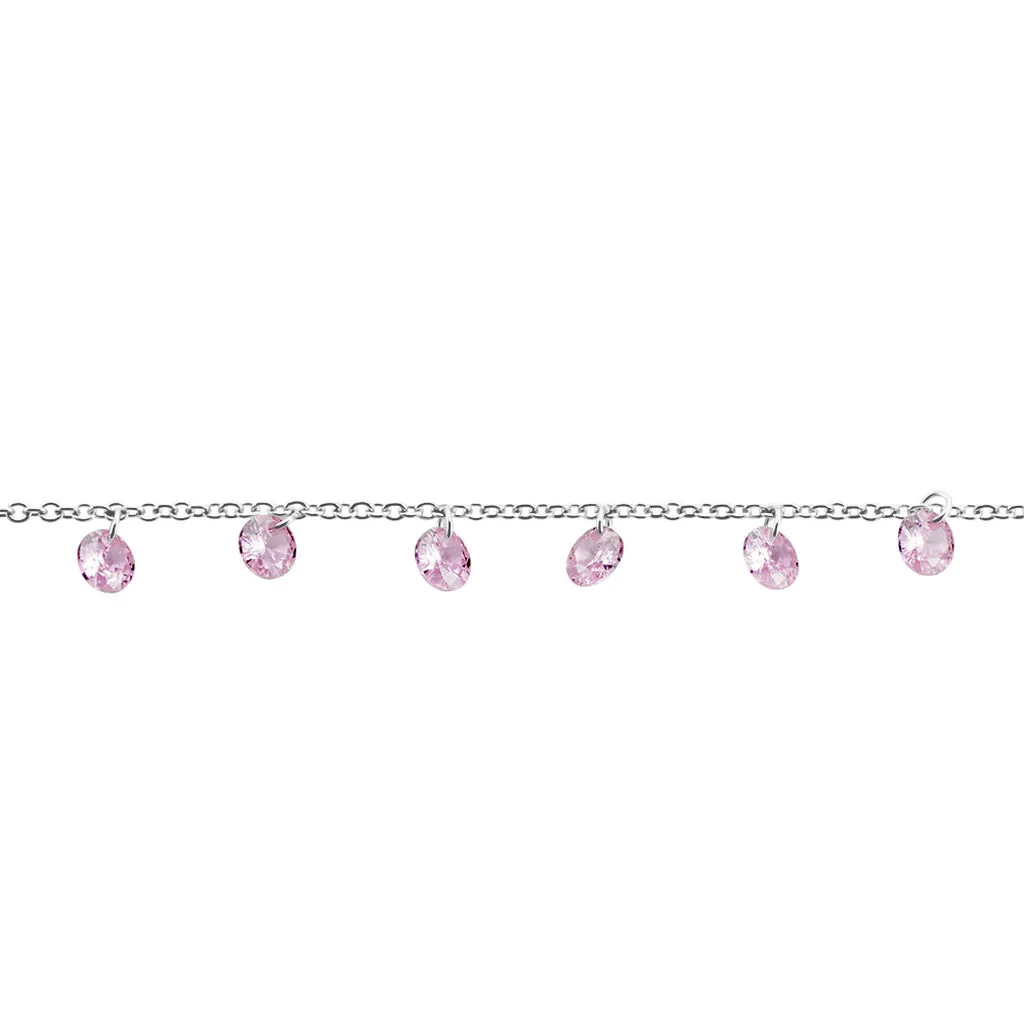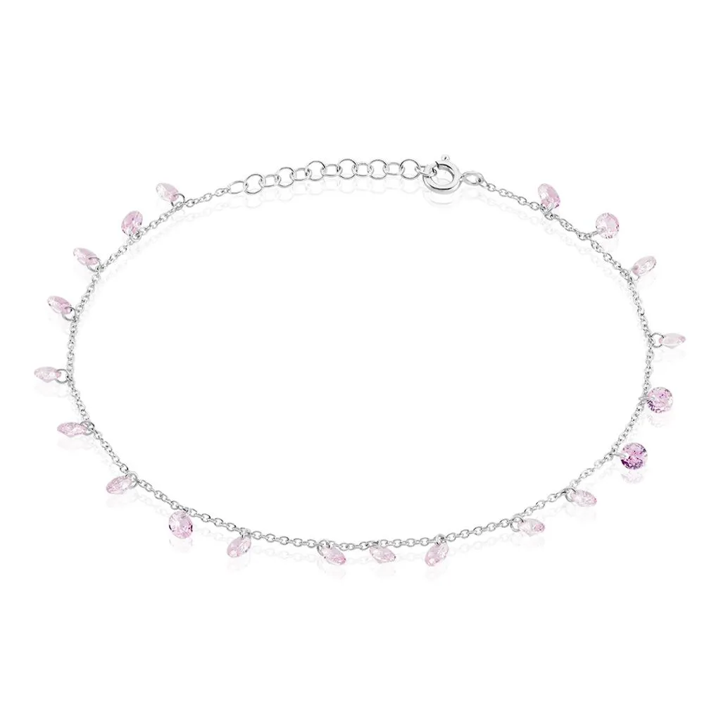 Chaîne De Cheville Argent Blanc 925/1000 Pampilles Oxydes De Zirconium Roses Maille Forçat 25cm
