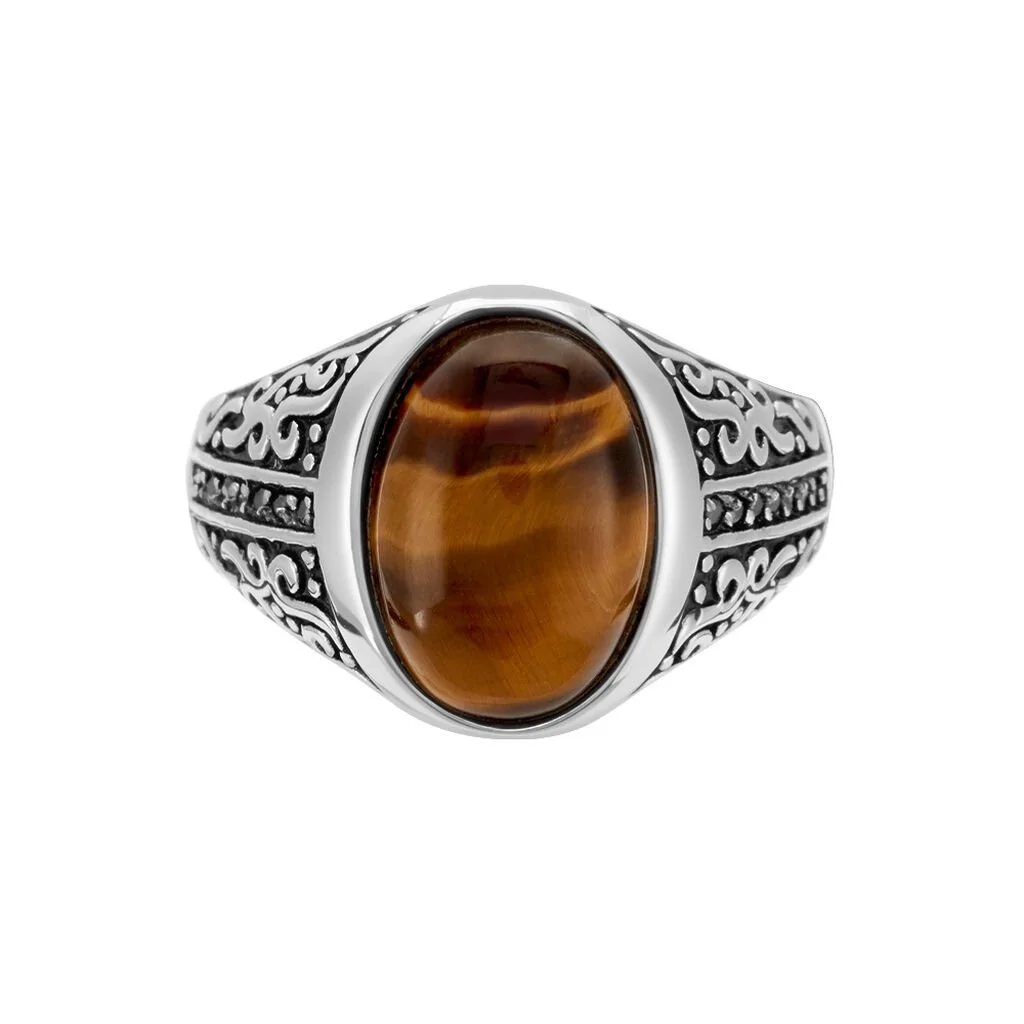 Chevaliere Acier Vieilli Plateau Ovale œil De Tigre