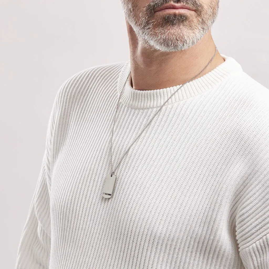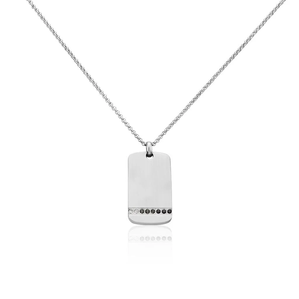 Collier Acier Blanc Plaque Rang Cristaux Noirs Maille Venitienne 60cm