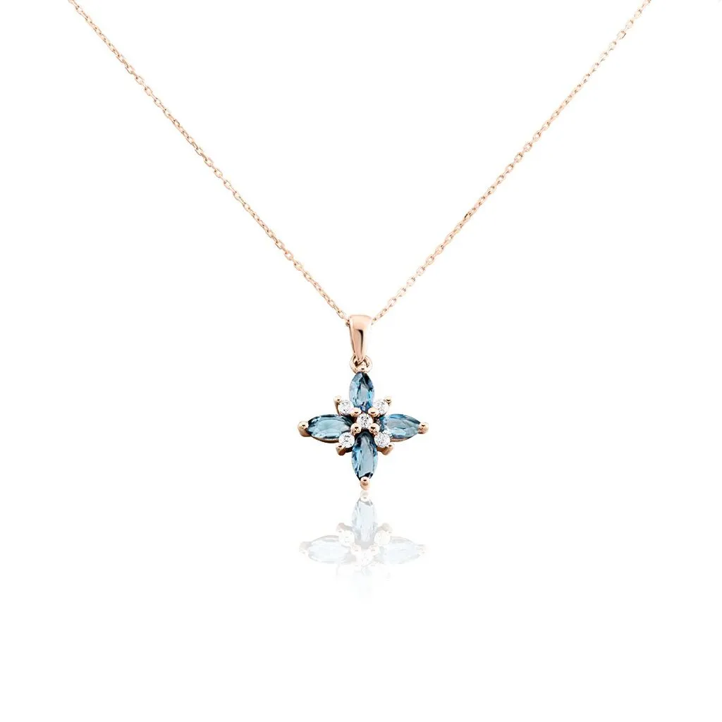 Collier Or Rose 375/1000 Motif Fleur Maille Forçat Topaze Bleu London Sertis Griffes Oxydes De Zirconium Blanc 42cm