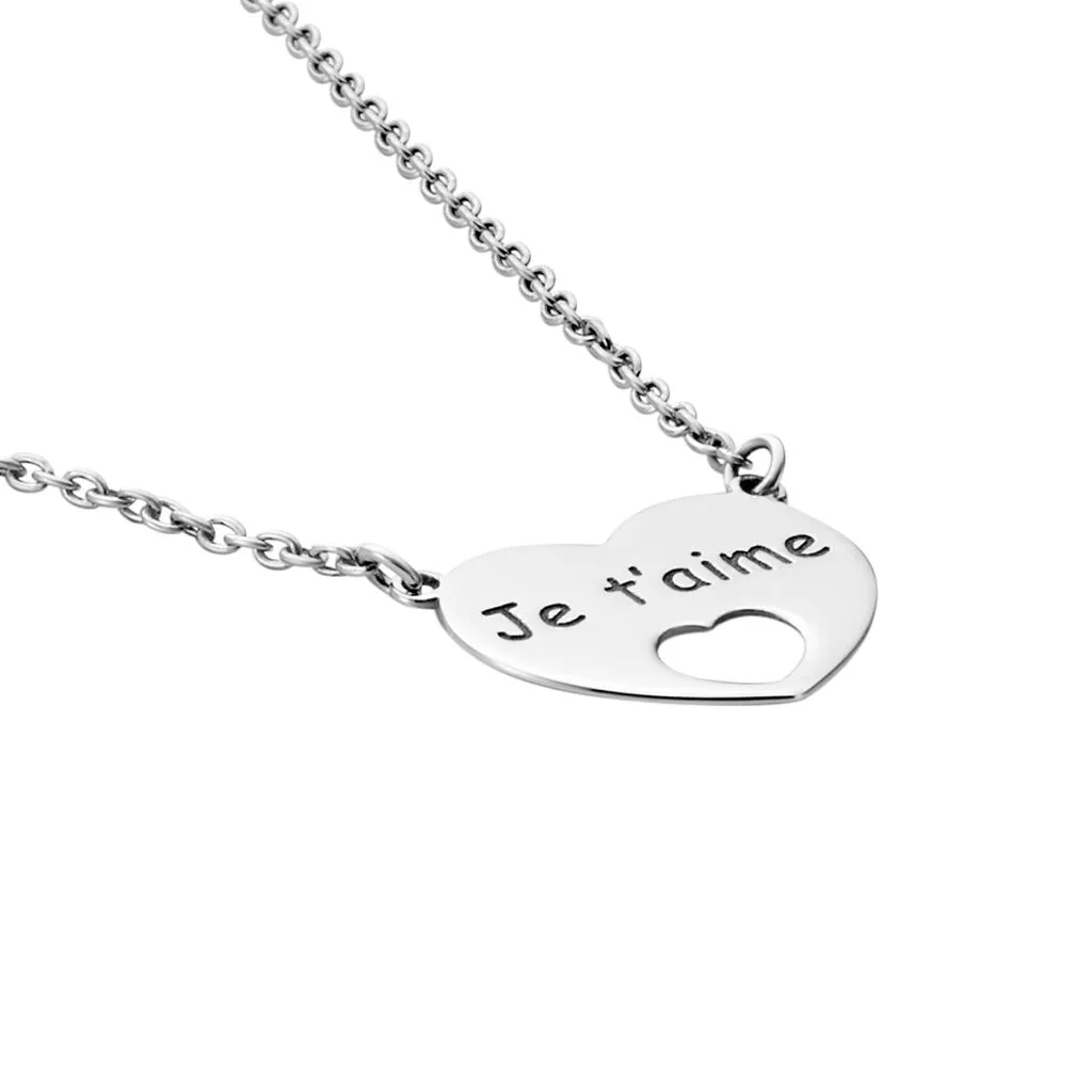 Collier Argent Blanc 925/1000 Coeur Message Je T’aime Maille Forcat Largeur 1.4mm 45cm